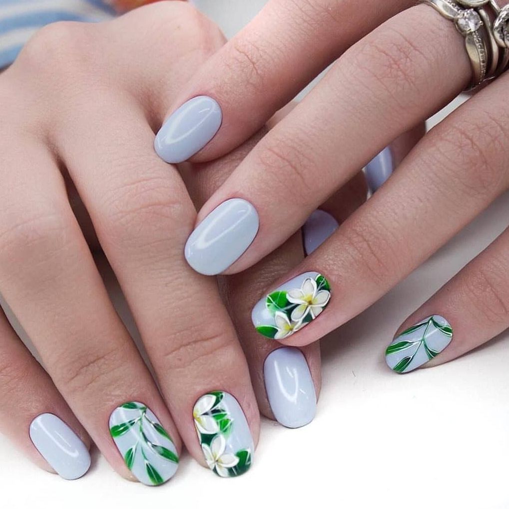 Что касается цветочного рисунка, то он не менее актуальный для отпуска. Его комбинируют с морским дизайном, создавая настоящее буйство красок. Также некоторые девушки подбирают цветы исходя из страны, в которую они планируют отправиться. К примеру, для азиатских стран лучше подойдет дизайн с плюмерией, а для Греции стоит сделать маникюр с рисунком оливы. Такой подход особенно интересный и уж точно не банальный.