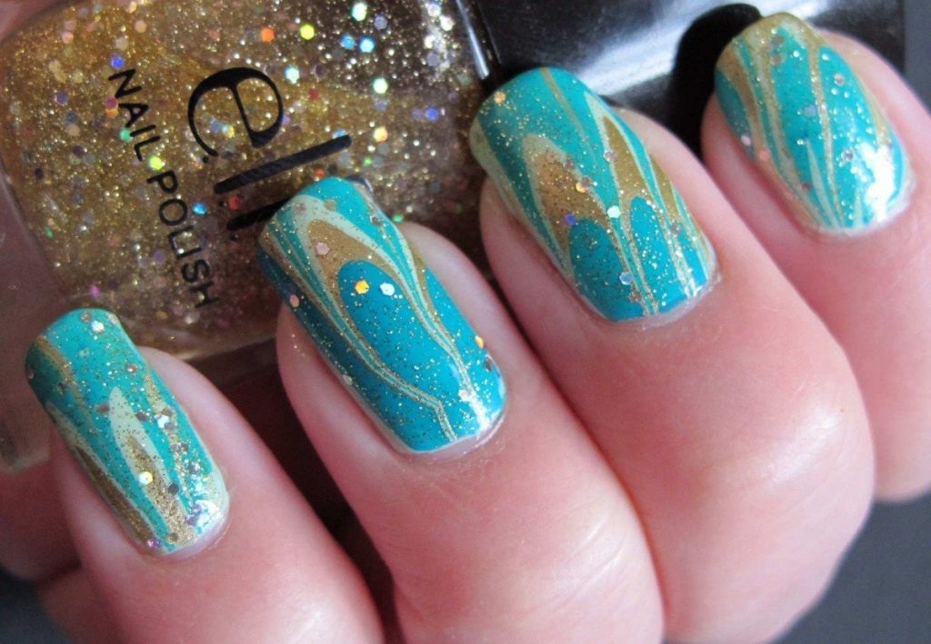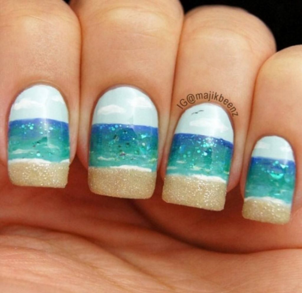 - дизайн с блёстками – актуально сейчас использовать в качестве имитации прибрежного песка блёски золотого цвета в комбинации с белыми и синими их расцветками; для этого можно использовать шиммер в качестве изображения песка и глиттер для воссоздания морского прибоя – эффект бесподобен;