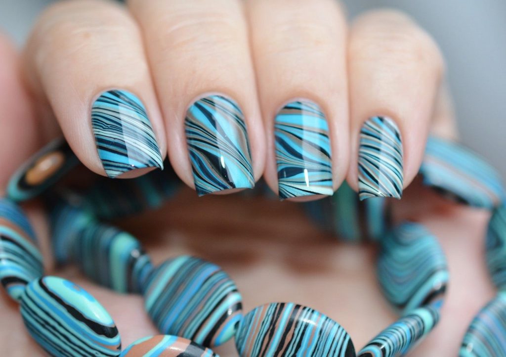 Разбитое стекло или размытые полосы белого и синего цветов могут помочь создать эффект воды. Нестандартным решением станет геометрический маникюр в оттенках синего или белого, дополненный скотчем.