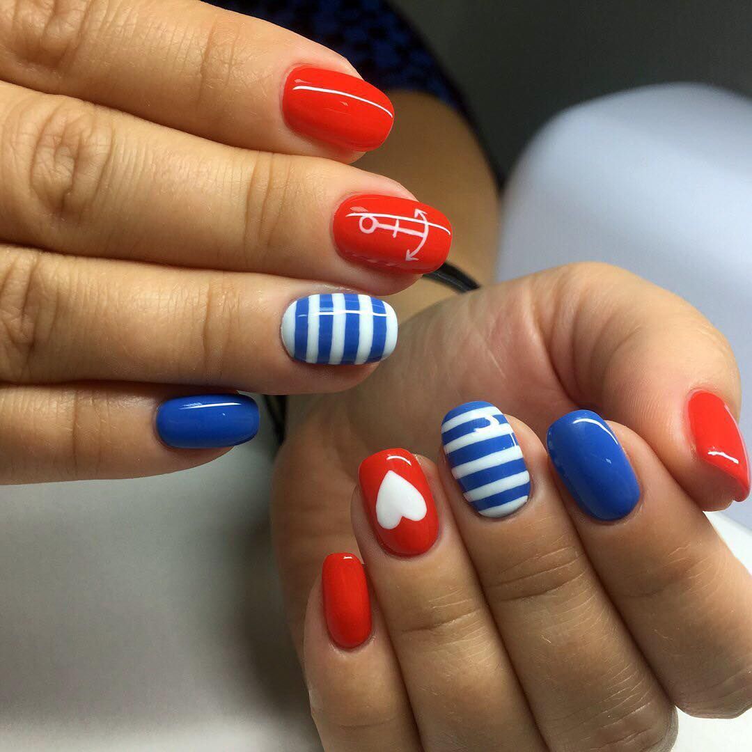 - «морячка» – популярный летний дизайн ногтей, представляющий собой нанесенный в качестве основы полосатый гель-лак с акцентированием внимания преимущественно на ногте безымянного пальца в виде якоря корабля; сине-белые горизонтальные полосы одной толщины в своем сочетании выглядят довольно соответствующе и к месту;