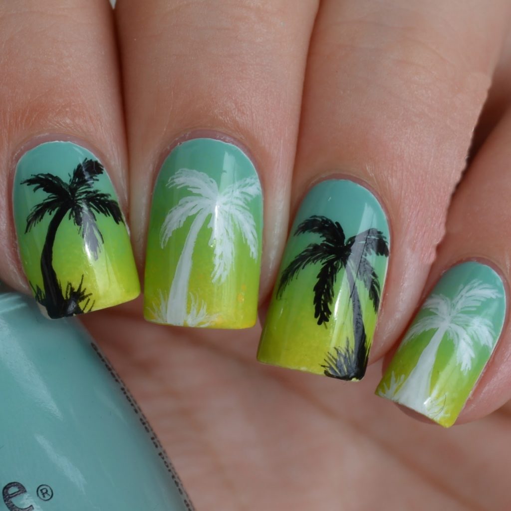Ввиду актуальных трендов 2019 года стоит отметить тематические рисунки для отпуска. Среди них привычные морские пейзажи, а также атрибуты в виде штурвала и якоря. Такие рисунки могут показаться банальными. Чтобы их немного разнообразить, рекомендуем использовать декоративные элементы. К примеру, подчеркнуть солнечные лучи вставками из втирки, а песок оформить специальной бархатной пудрой.