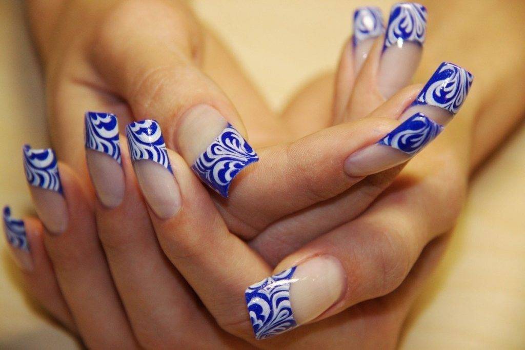 Конечно, если у вас есть талант художника, вы легко сможете нарисовать водную стихию самостоятельно. В виде волн можно сделать улыбку в френче или лунном маникюре. Для этого достаточно изобразить их в виде гребешка в синем, белом или голубом фоне.
