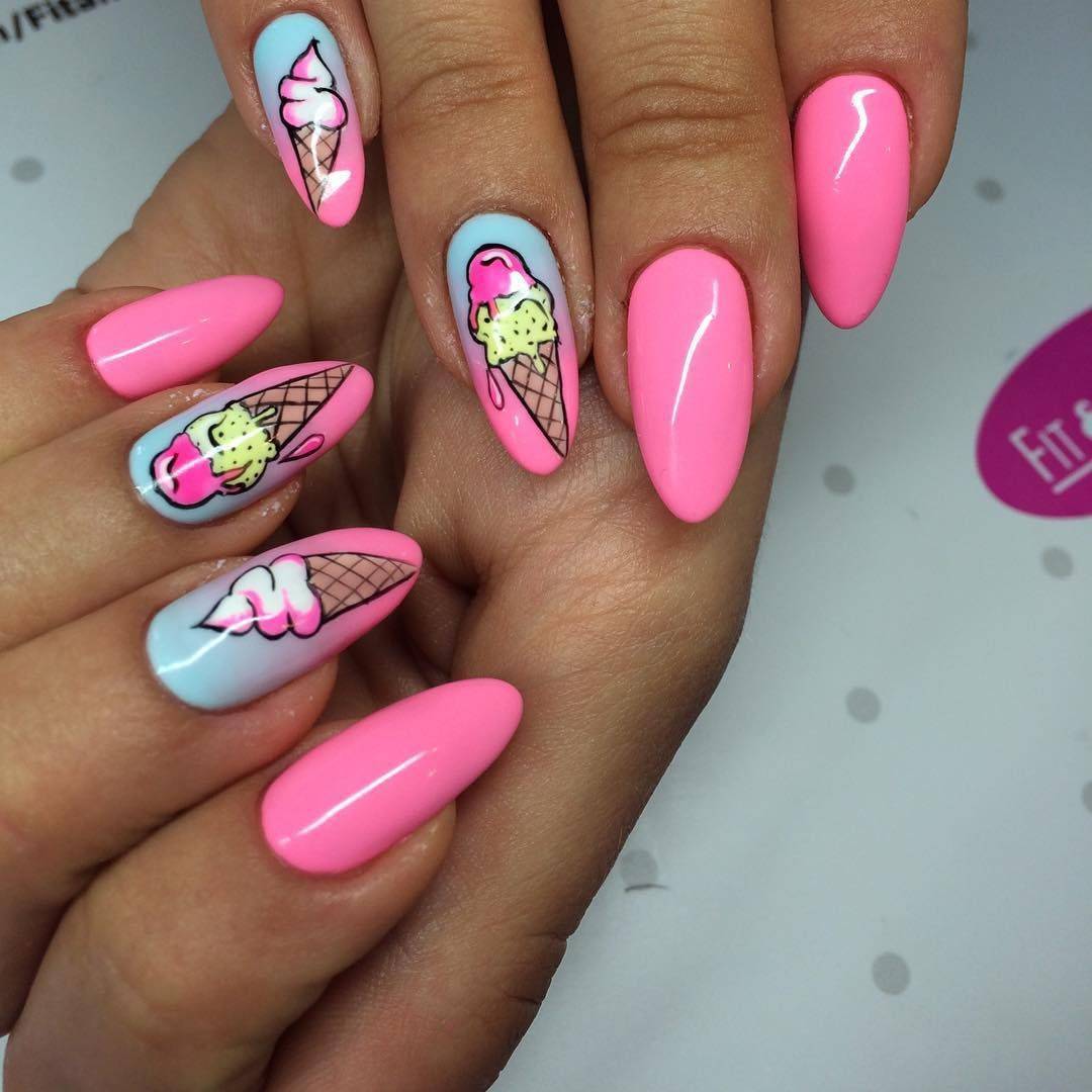 Также красиво смотрится и изображение на ногтях мороженного, при этом актуально добавить обрисовку морского пляжа или же пальм. На длинных ногтях очень красиво выглядит техника разводов по мокрому гель-лаку, выполненная в голубой или синей палитре.