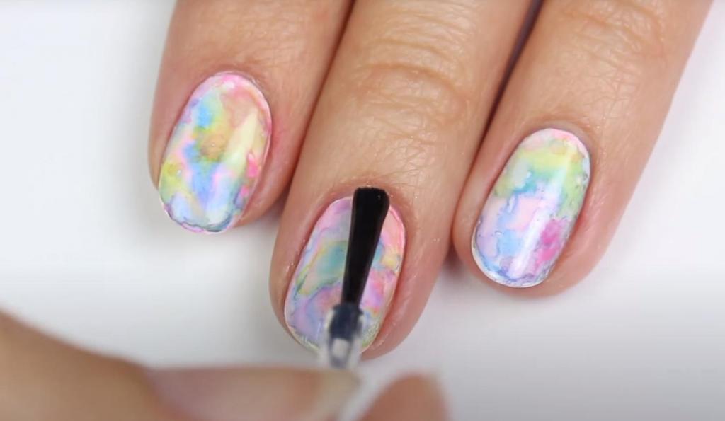 А в центре останется чистый цвет. В результате получится красивый цветовой переход, напоминающий акварельный рисунок. В зоне соприкосновения розовой и желтой краски образуется оранжевая полоска. Сочетание желтого и голубого дает зеленый цвет. Если немного краски попало на кожу вокруг ногтя, для ее удаления не потребуется ацетон или жидкость для снятия лака. Ее легко можно смыть губкой или кистью, смоченной водой. Когда краска подсохнет, сверху наносят глянцевый фиксирующий прозрачный лак, который сгладит неровности и укрепит рисунок. Или матовый топ.