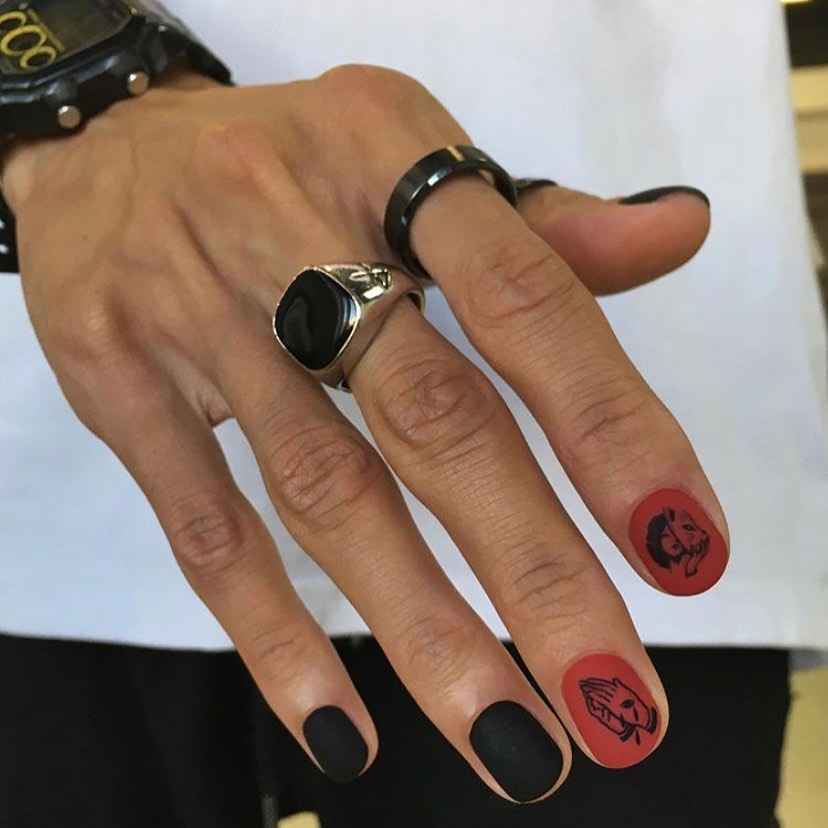 Смелые мужчины могут попробовать яркий маникюр. В этом случае можно обратиться к технике фен-шуй и раскрасить каждый ноготь в разный цвет. Однако лучше цветом выделить лишь несколько ногтей, в то время как остальные оставить “голыми”. Яркости в мужской маникюр можно добавить и с помощью цветных рисунков: огня, леопардового принта, смайлика, надписи и так далее.