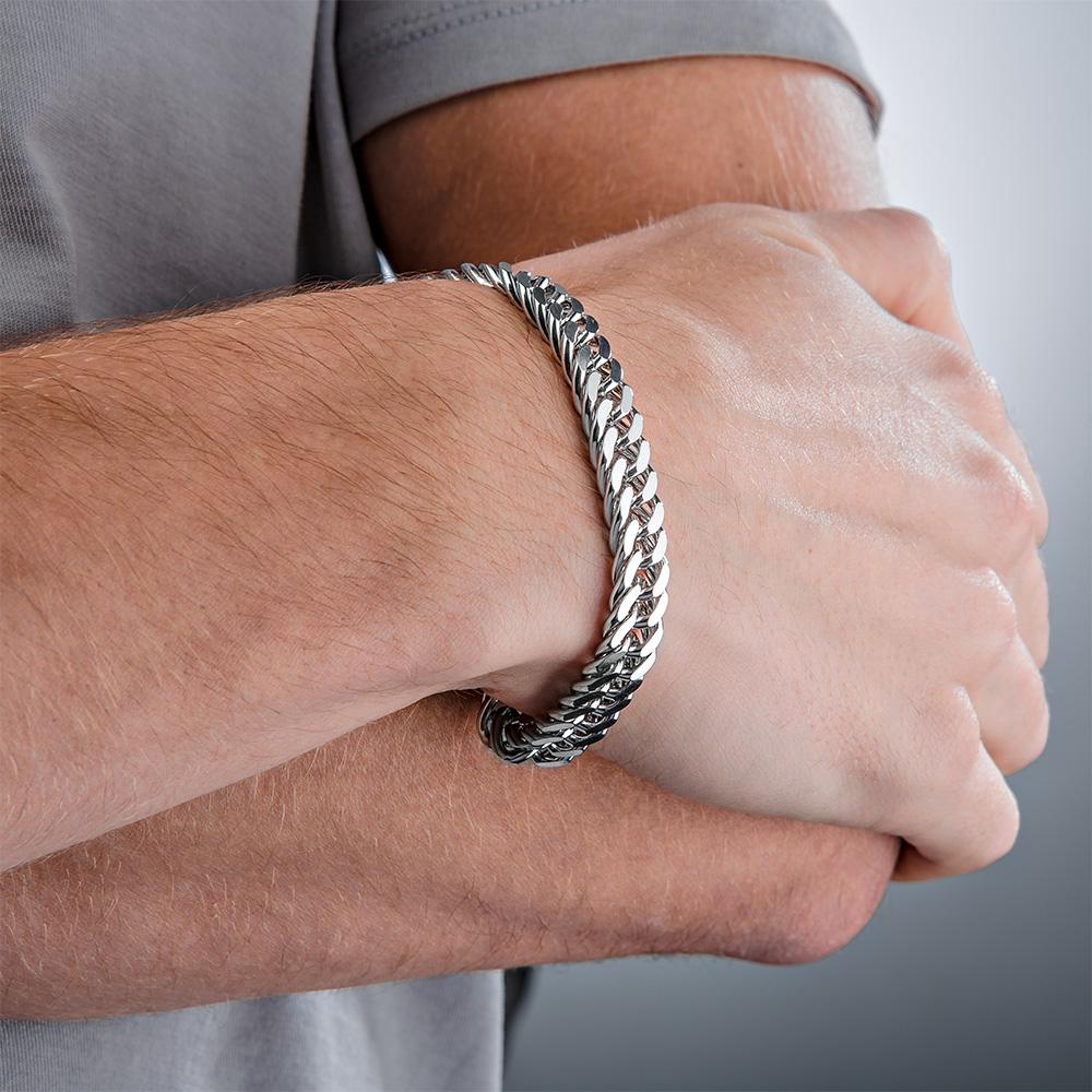 Материал не такой дорогой, как золото, поэтому требований к нему особых нет. Именно поэтому серебряные браслеты пользуются большой популярностью у мужчин в России. Это уникальные и строгие аксессуары, подходящие для любого возраста. Кроме того, в языческих верованиях серебряным браслетам предписывались особые свойства. Считалось, что они могут оберечь носителя от потусторонних сил.