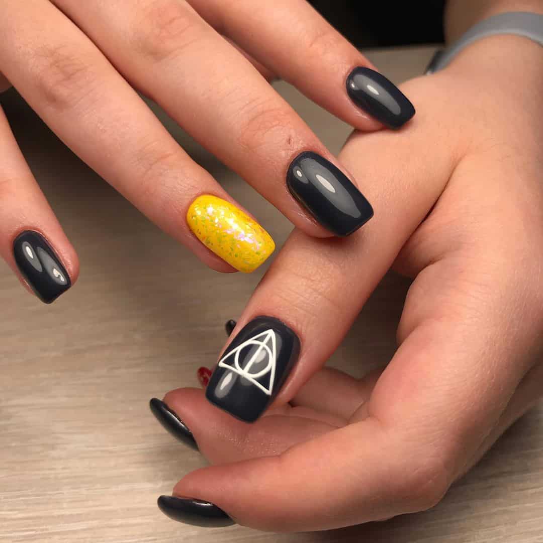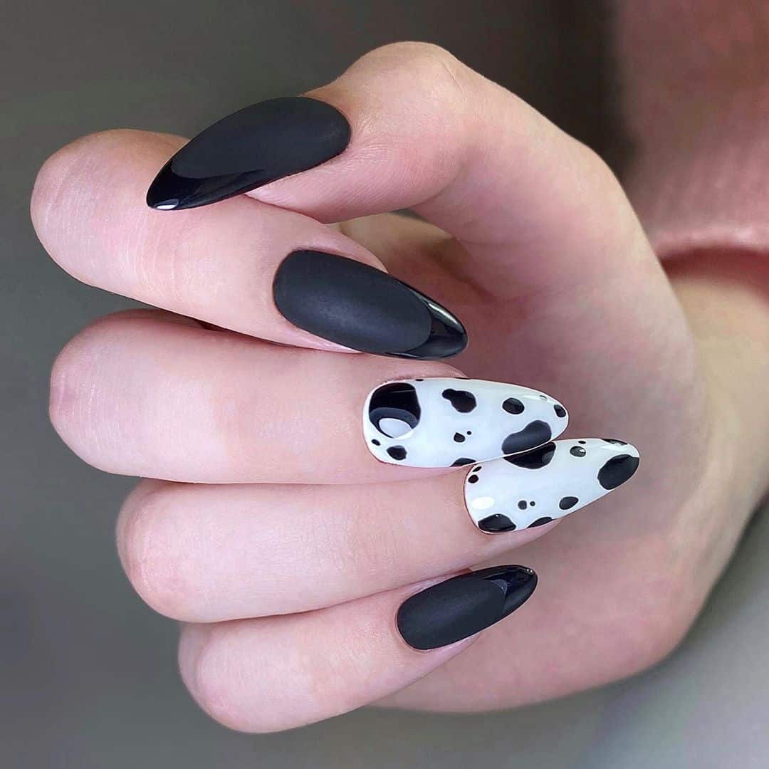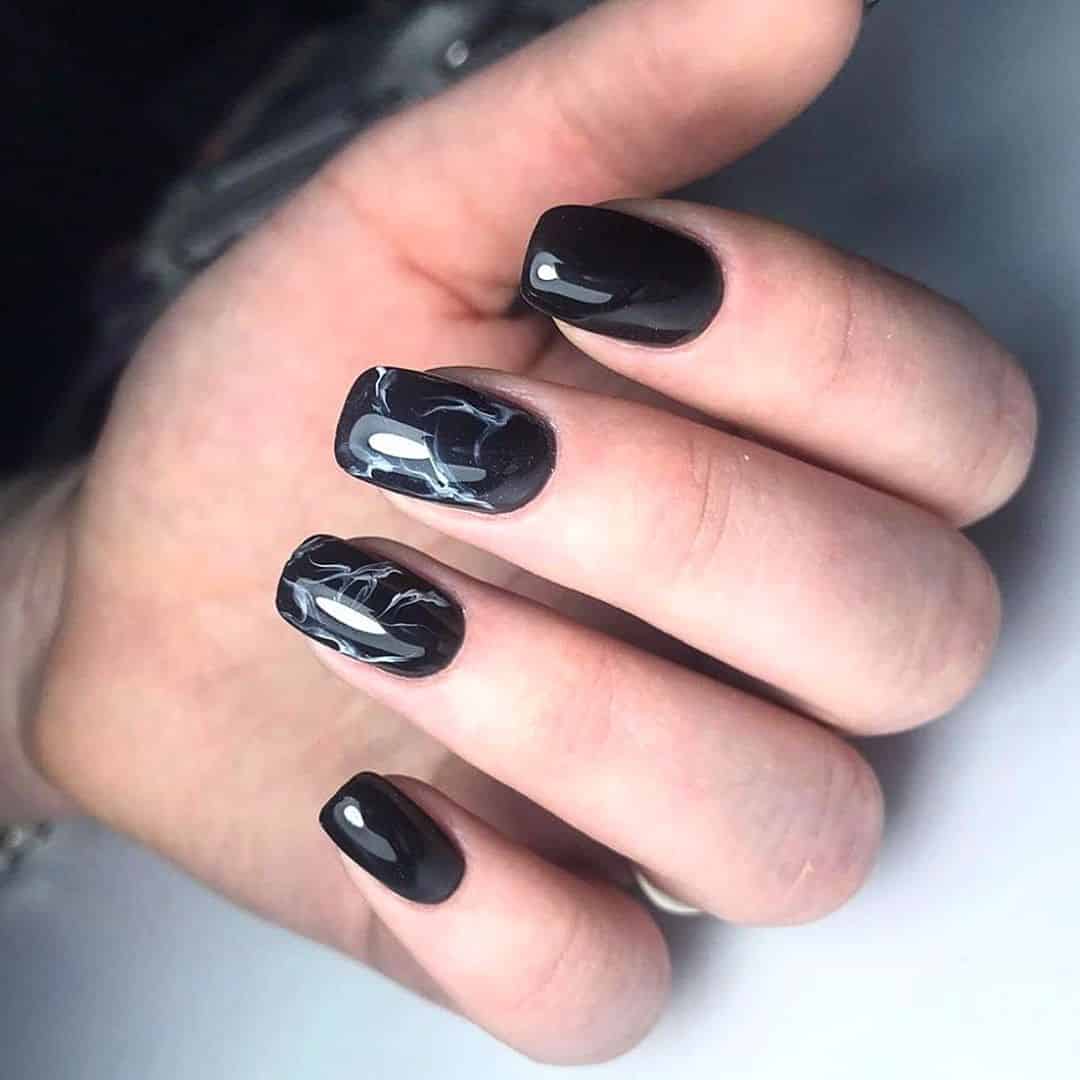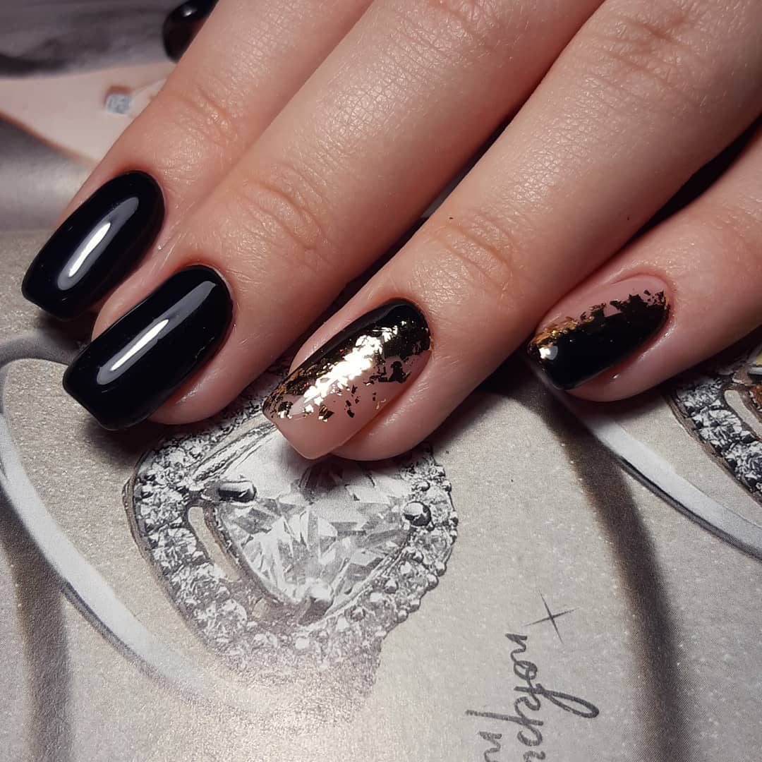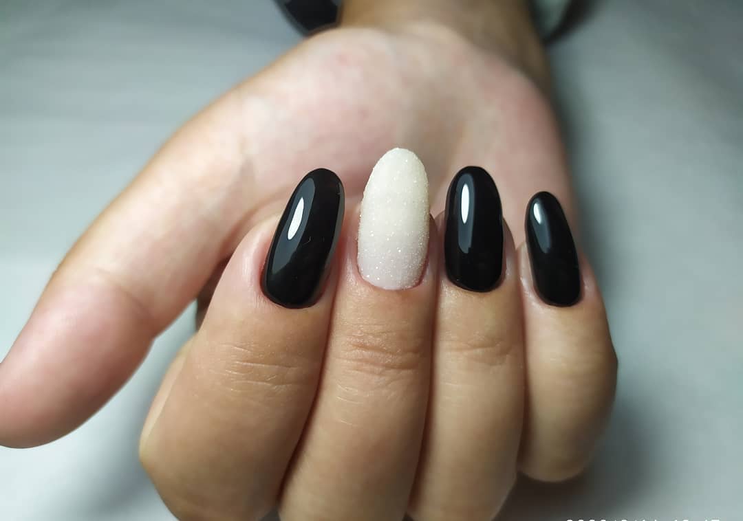 Черные покрытия хороши тем, что являются более стойкими при ежедневной носке. Также, в зависимости от использования глянцевых или матовых покрытий, можно создать как спокойный, офисный маникюр на короткую длину, так и торжественный вечерний дизайн на длинных ногтях.