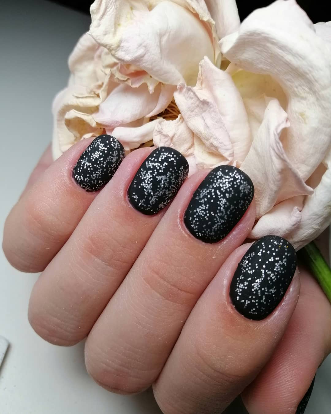 Матовый маникюр в черном цвете стал очень популярным, он притягивает и манит. Кажется, будто сама черная материя была добавлена при изготовлении этого покрытия. В таком случае дизайн лучше не делать, а оставить покрытие однотонным, без добавления других матовых лаков и украшений.