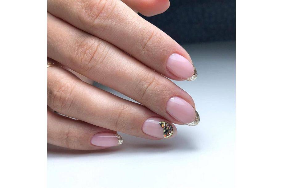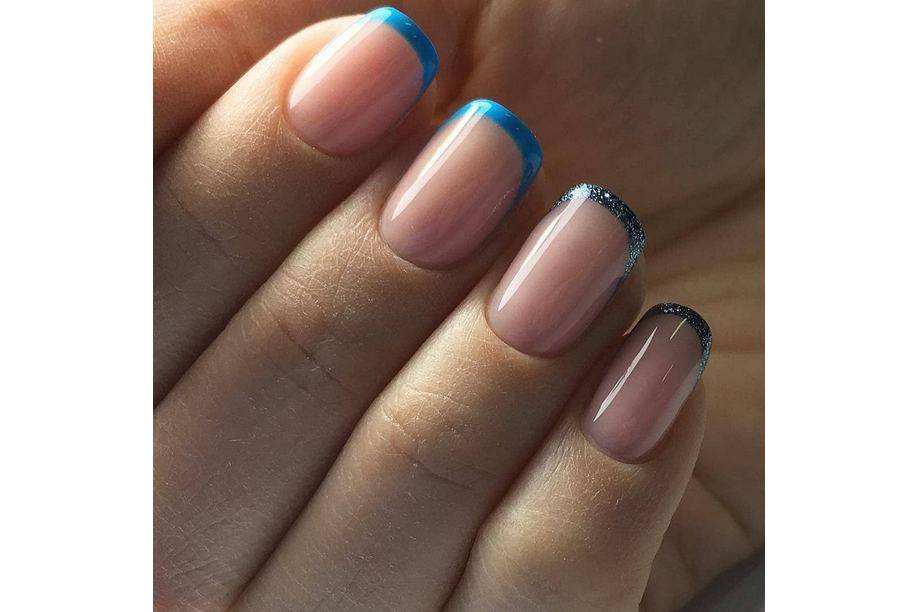 В этой вариации френча на свободный край ноготка наносится очень густой слой блестящего лака или микропудры. Такой маникюр будет уместен в любой обстановке. Нужно только грамотно подобрать цвет блесток. Золотые подойдут для торжественного события, а нежно-голубые — для первого свидания и даже для работы, если там не очень строгий дресс-код.