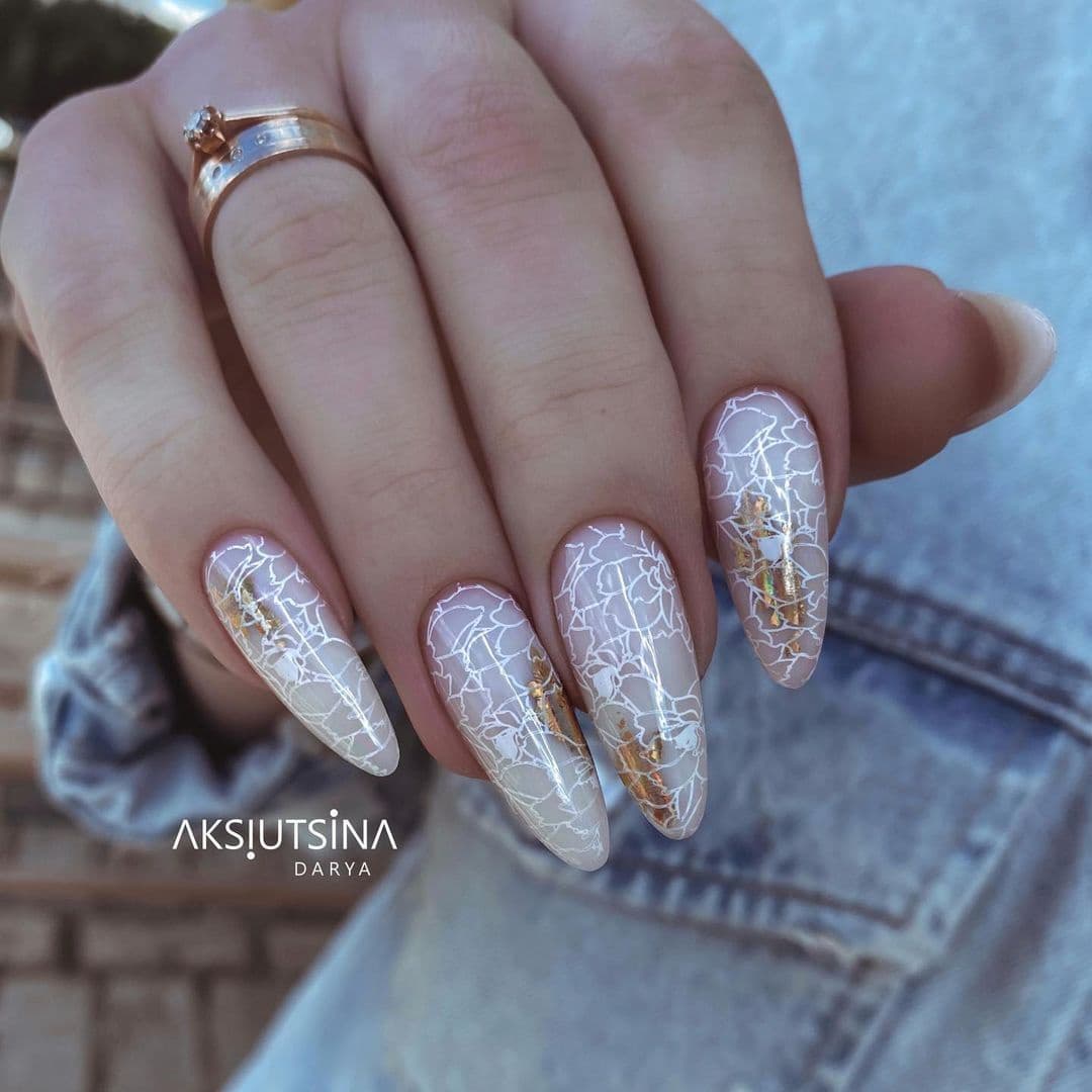 По-настоящему соблазнительно и роскошно смотрится модный нюдовый маникюр 2021-2022 в дуэте с эффектом «вуали»