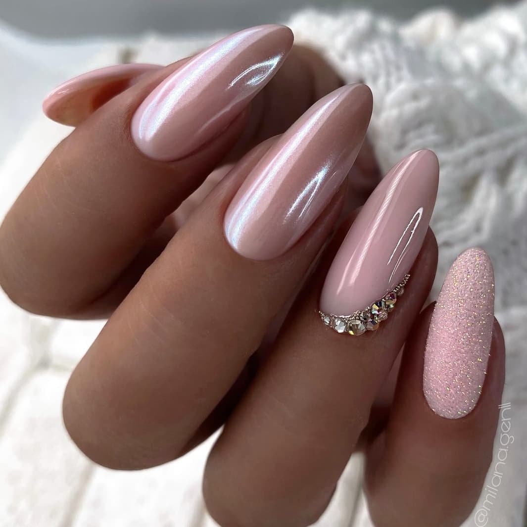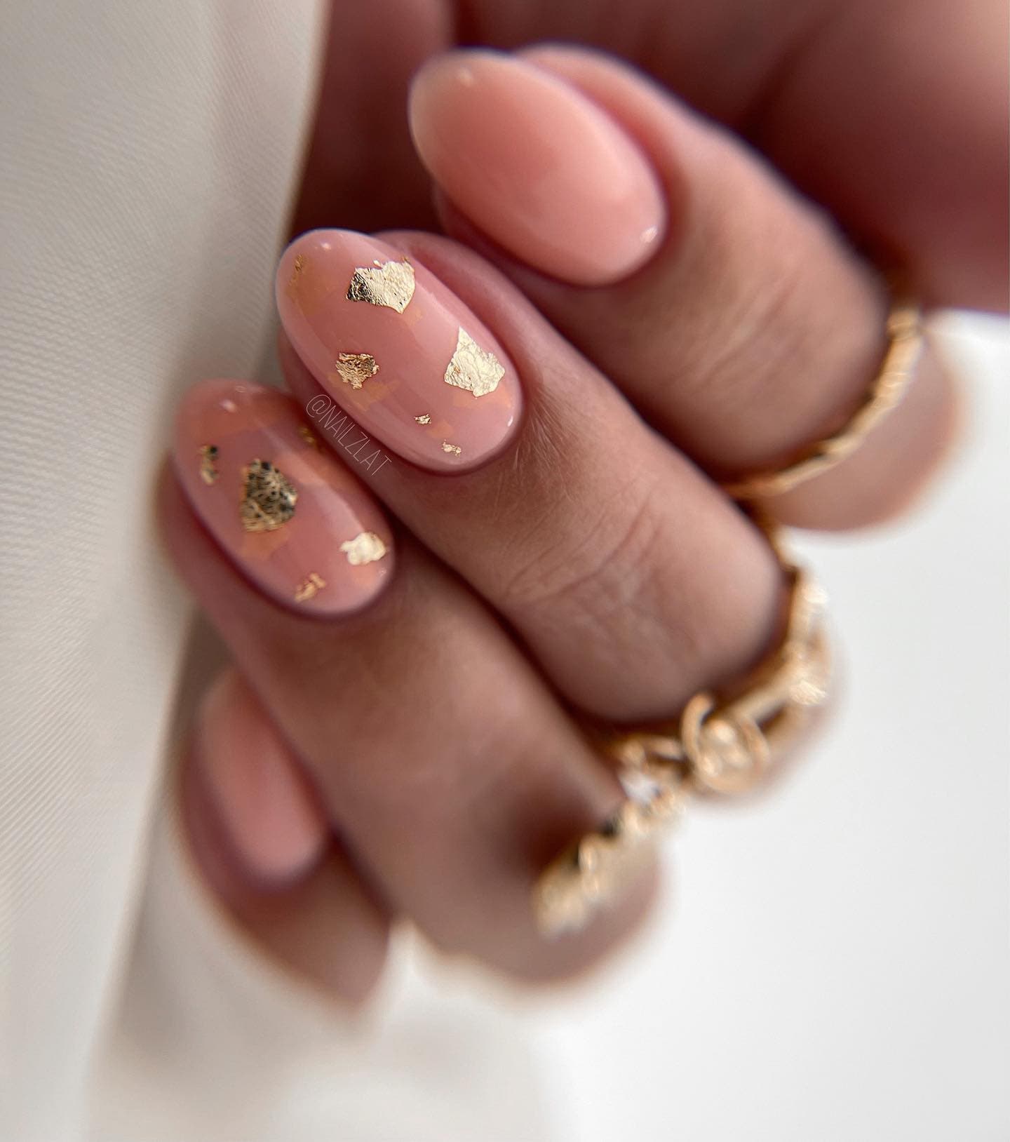 Прекрасным дополнением нюдового маникюра станет металлическая зеркальная втирка, которую можно подобрать под сам оттенок нюда, и выделить им несколько ноготков или сделать втиркой весь маникюр.
