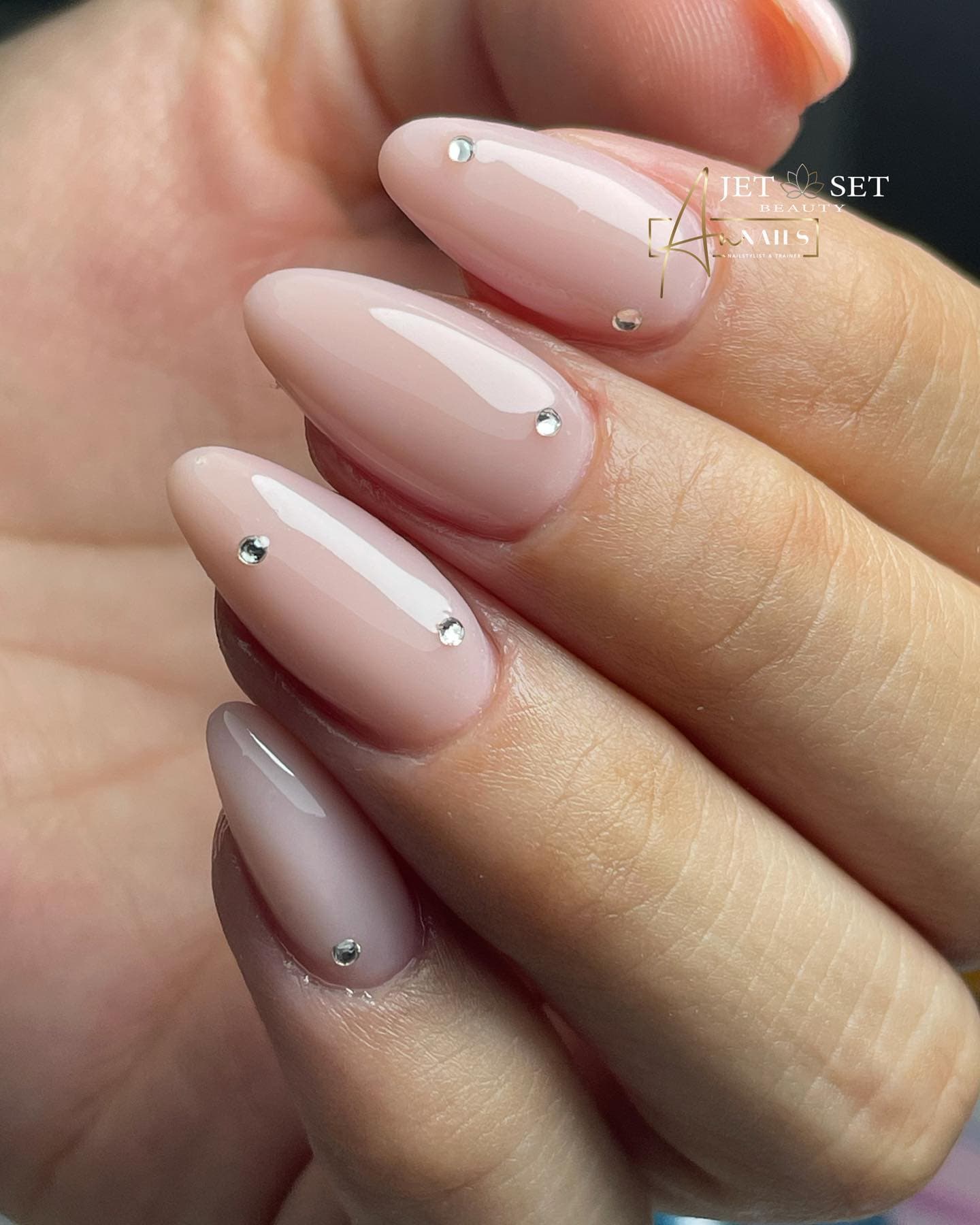 Заметить мелкие блестящие частицы могут более крупные не менее эффектные украшения в виде страз. Трендовый нюдовый маникюр 2021-2022 в изысканном дизайне стразами не оставит равнодушной ни свою хозяйку, ни окружающих.