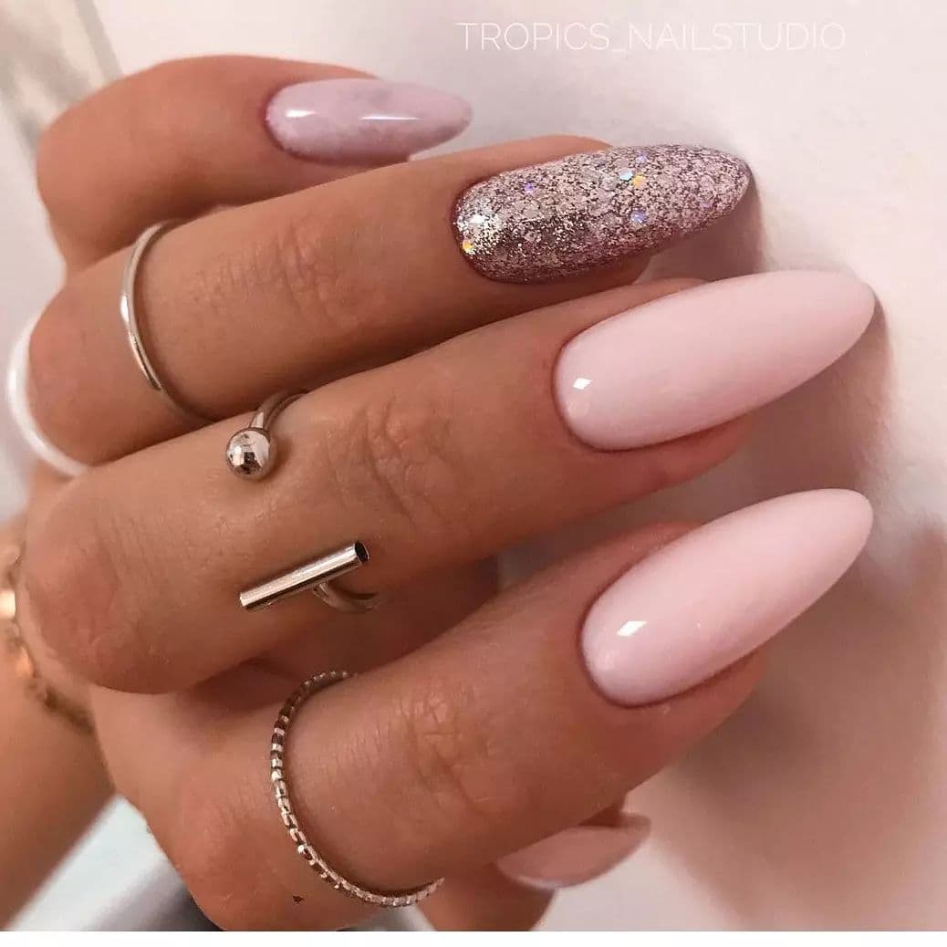 Отказаться от блесточек порой бывает невозможно, особенно если хочется придать ноготкам сияния и нарядности. Модный нюдовый маникюр всячески поощряет в своем дизайне блестки и глиттер.