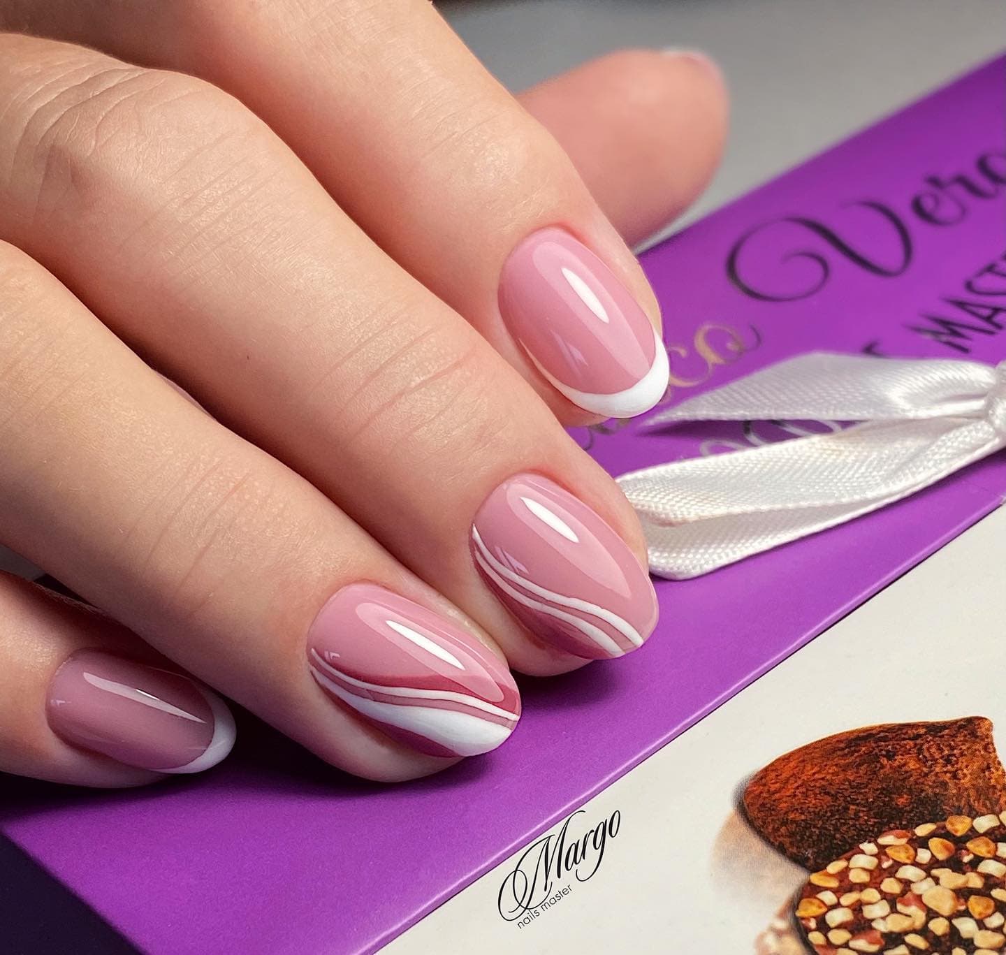Отличный вариант рисунка и маникюра – нежный розовый с белым.