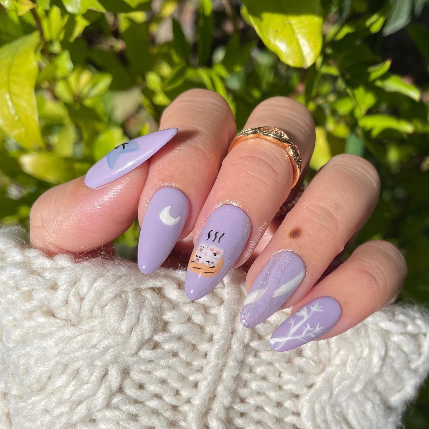Сама по себе лаванда — символ спокойствия, умиротворения, крепкого сна. Не зря это растение способно благоприятно воздействовать на нервную систему и дарить нам приятную безмятежность. И на подсознательном уровне один только оттенок этого цветка уже воспринимается нами как что-то хорошее. Поэтому лавандовый оттенок в маникюре — отличный вариант нежного дизайна ногтей. Фото классического и более яркого нейл-арта с этим цветом мы показываем ниже.