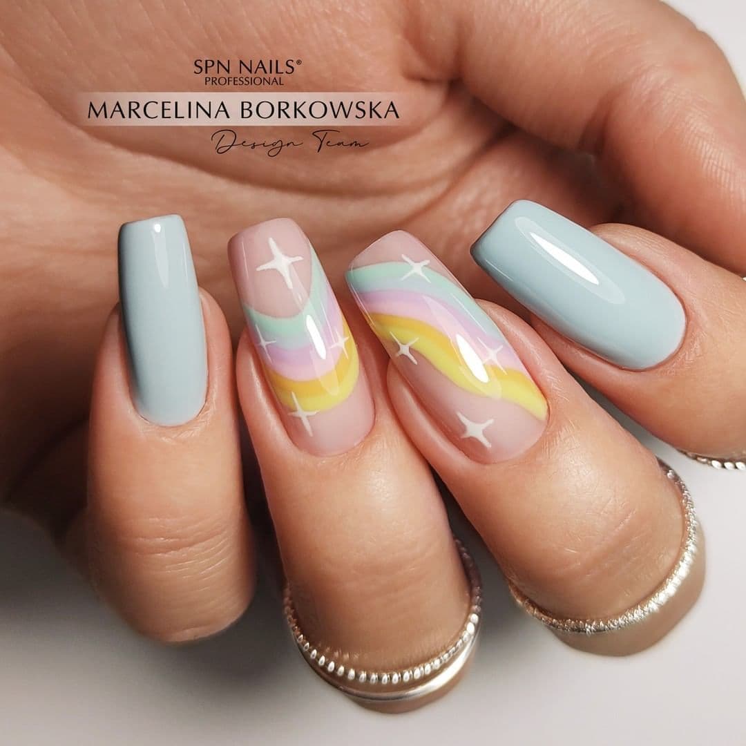Радужный маникюр так назван потому, что он соединяет в себе все 7 цветов радуги в разных вариациях и сочетании. В основном он яркий, но возможно и более нежное его исполнение, когда в основе лежат пастельные тона.