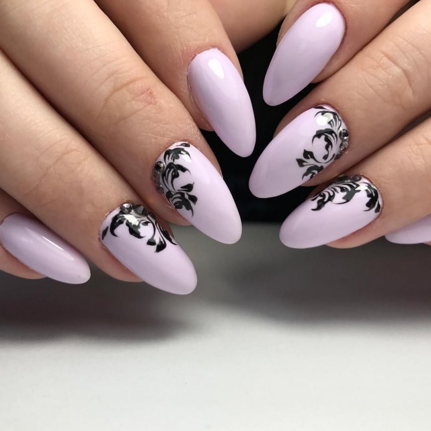 - С узорами и вензелями. Имеются в виду кружевные узоры, а также белые, черные и золотые замысловатые вензеля. Оформление ногтей ограничивается только фантазией и умением ногтевого мастера. Чтобы не испортить маникюр, рекомендуется разрисовывать не больше двух пальцев на каждой руке.