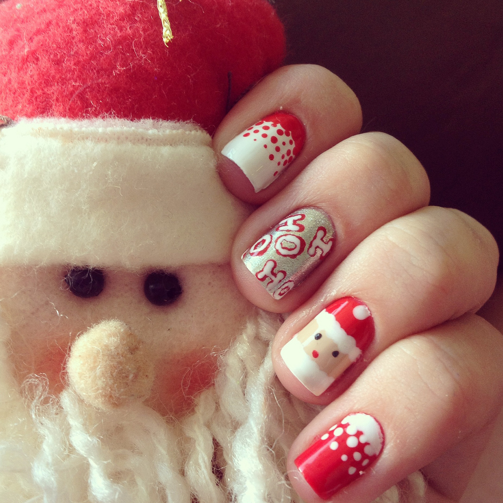 - На безымянных ногтях нарисуйте красную шапочку дед мороза с белым отворотом и помпоном.