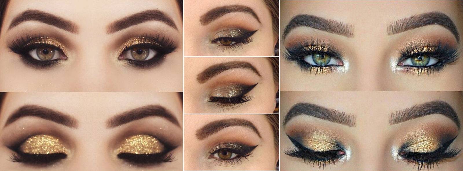 Следует сделать акцент именно на глубине и притягательности чарующего кареглазого взгляда. Карий цвет глаз в макияже непременно нужно «подсвечивать». Эту задачу сможет с легкостью решить золотистый блистающий шиммер. В новогодний вечер его можно наносить очень щедро, дополняя при этом яркой дымкой цветной подводки.