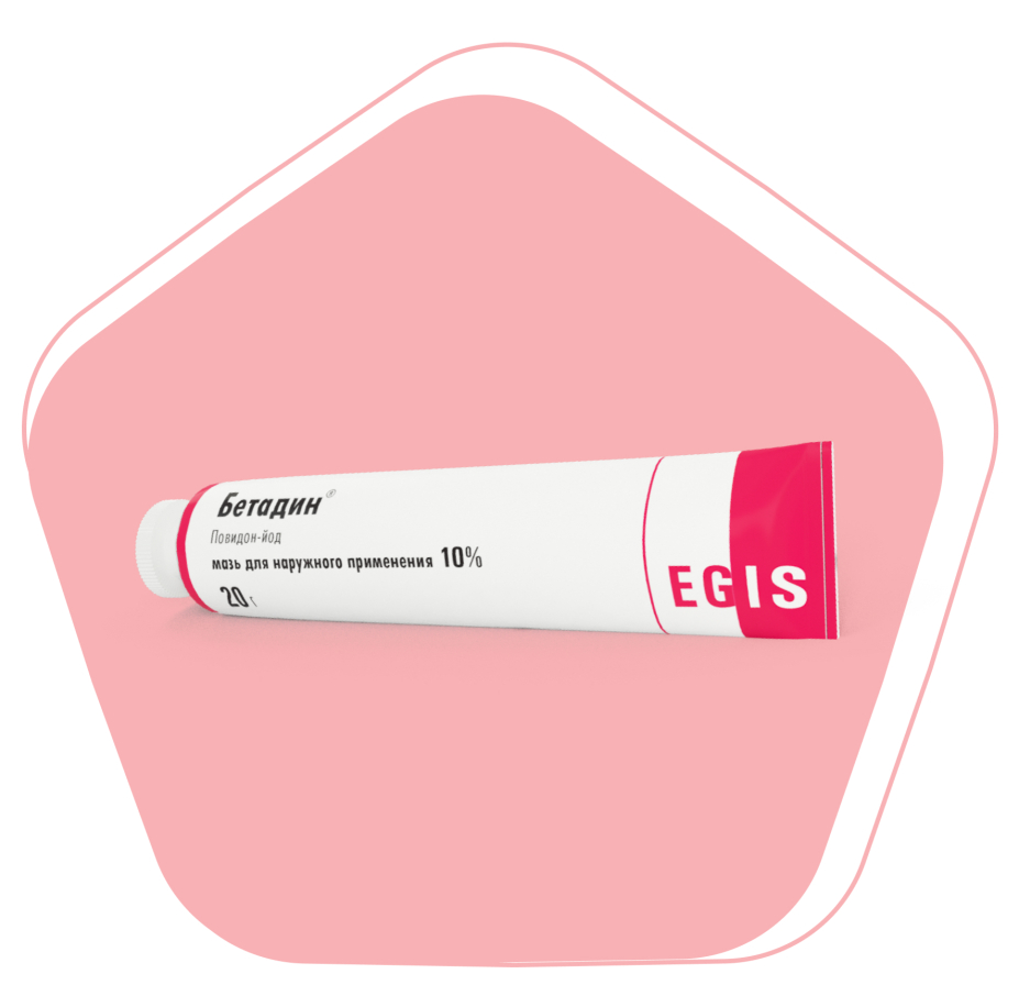 Повидон-йод входит в состав мази Бетадин. Он способен вступать во взаимодействие с клеточной стенкой грамположительных и грамотрицательных бактерий и разрушать ее.