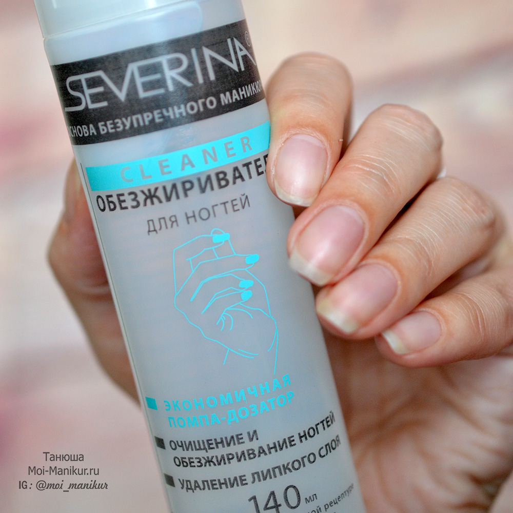 Severina. Обезжириватель «Северина» имеет сравнительно невысокую стоимость, при этом объединяет в себе стандартные функции обезжиривающей жидкости и классического клинсера. Устраняет излишки влаги с поверхностных слоев ногтя.
