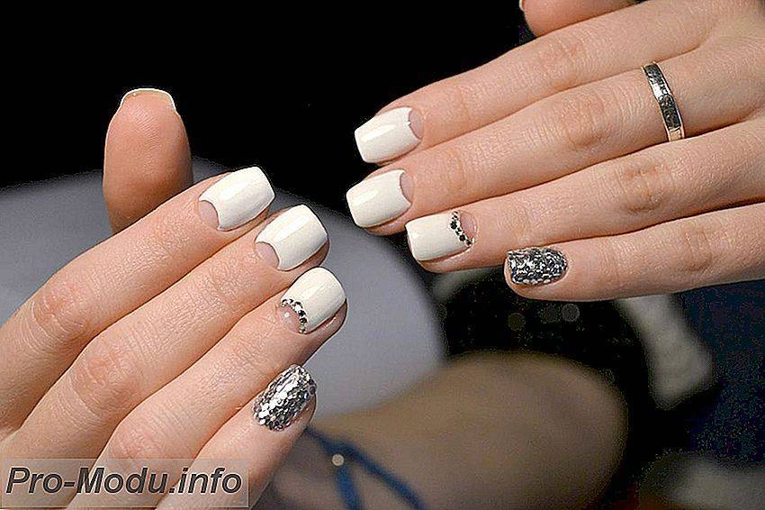 - френч с инкрустацией камней – далеко от предыдущего ногтевого метода нанесения материалов этот вид не ушёл, здесь просто добавилось закрепление в прикорневой зоне большого пальца линейной россыпи камней, внедрённых в имитированную серебряную оболочку. Словно драгоценность, опущенная в оправу украшения, ярко и аристократично смотрится линия из серединного камня крупного размера и отходящими в стороны более мелкими;