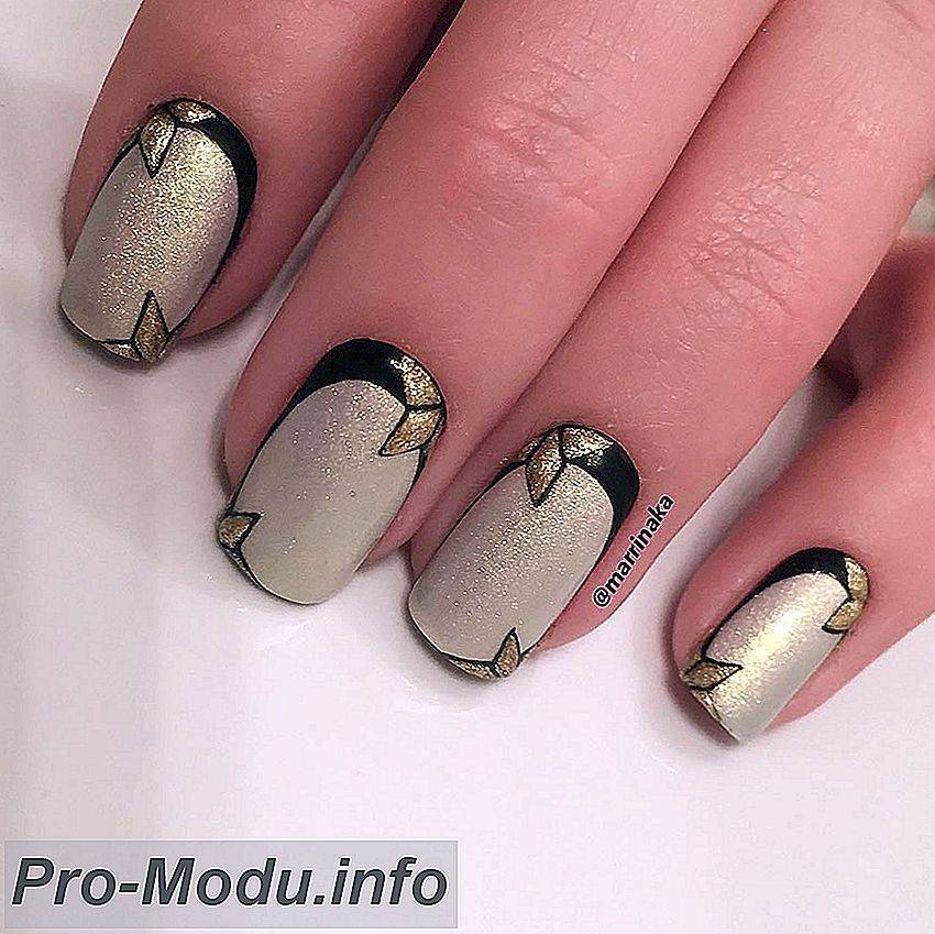 - чёрное золото – восхитительная новинка современности, предполагающая угольную основу базового покрытия, золотую улыбку френча и использование хаотично пересекающихся клейких тонких золотых линий в виде замысловатой геометрии – эффект потрясающий.