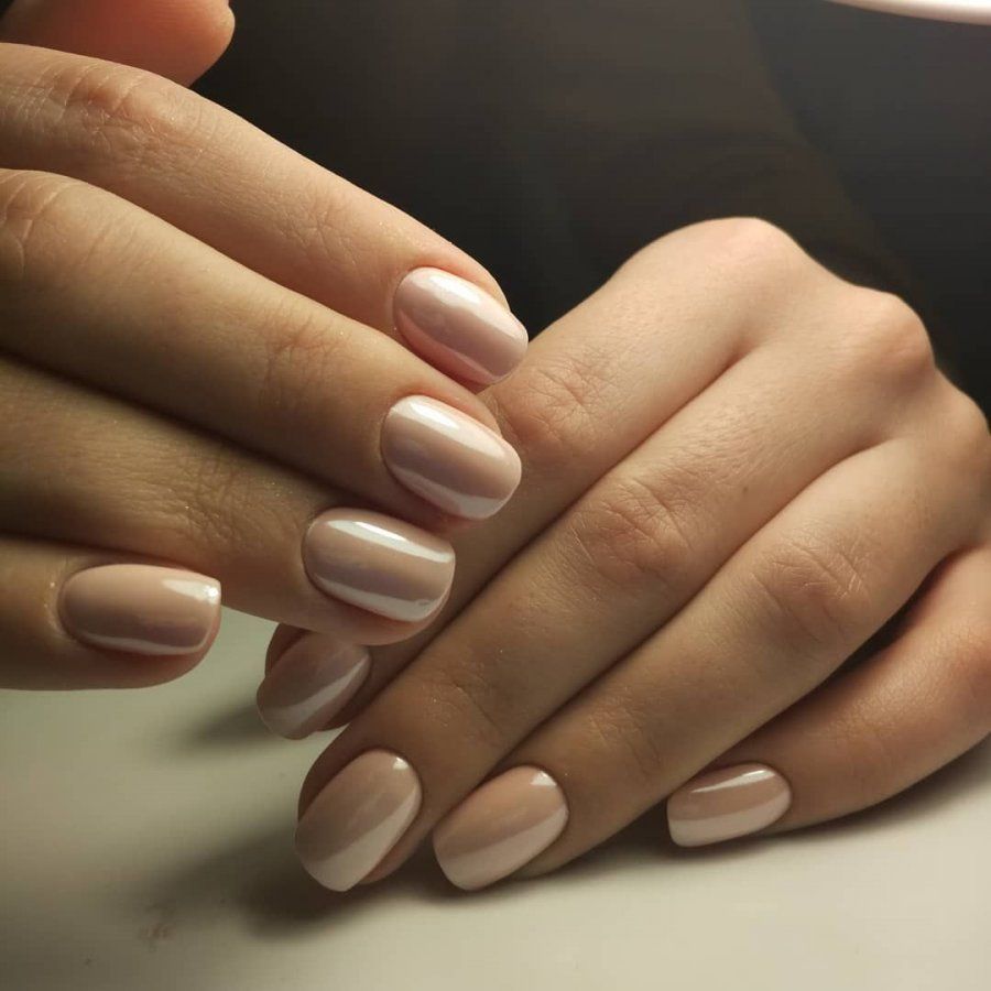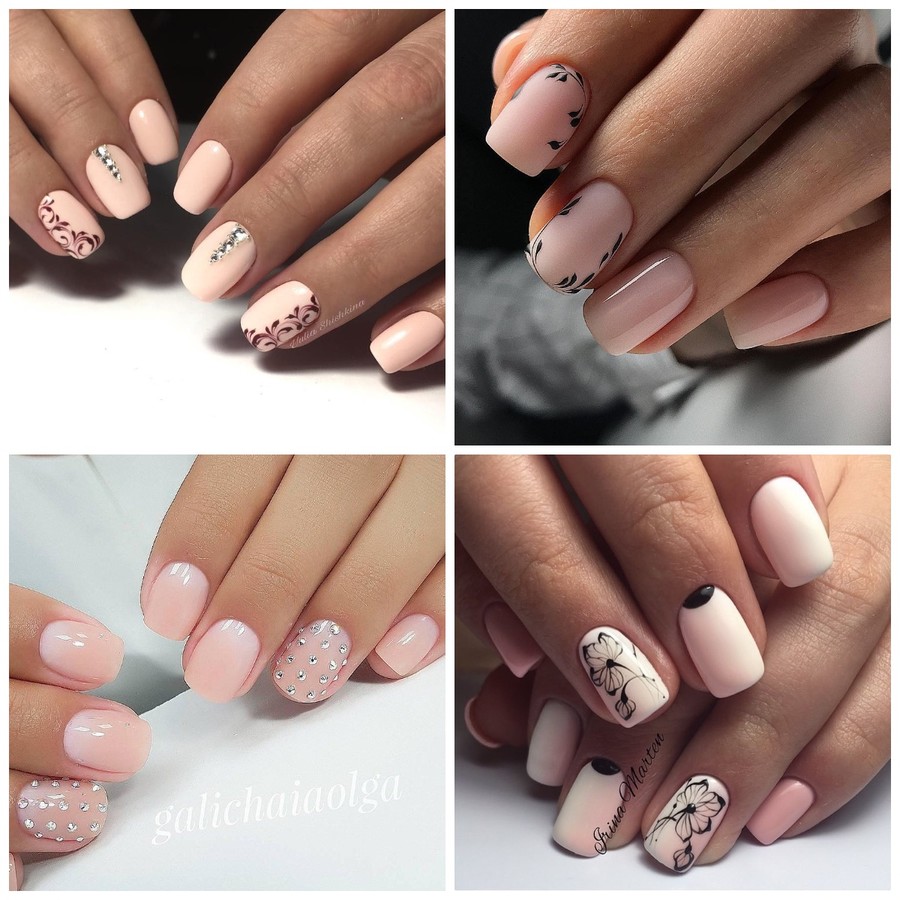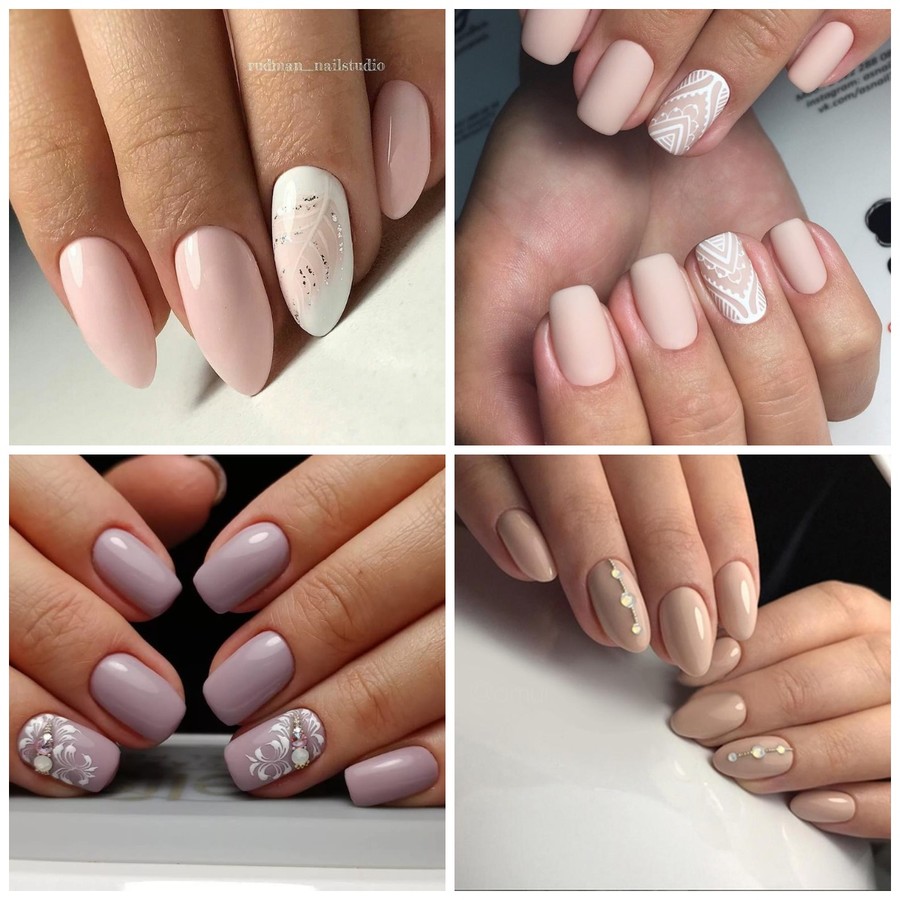 Все нюдовые тона – это прекрасная база для делового маникюра. Чтобы розоватые и бежевые покрытия не выглядели скучно, их можно дополнить мелкими рисунками, втиркой, акриловой пудрой, фольгой.