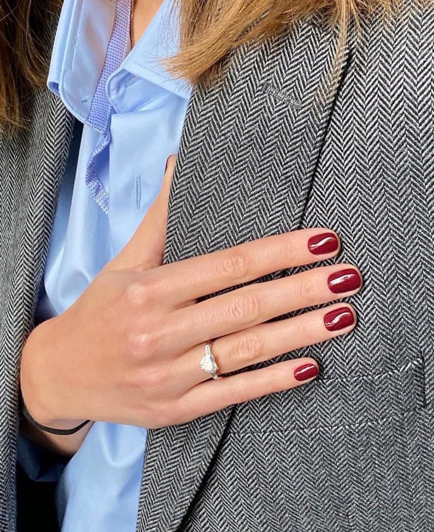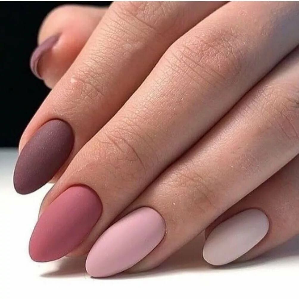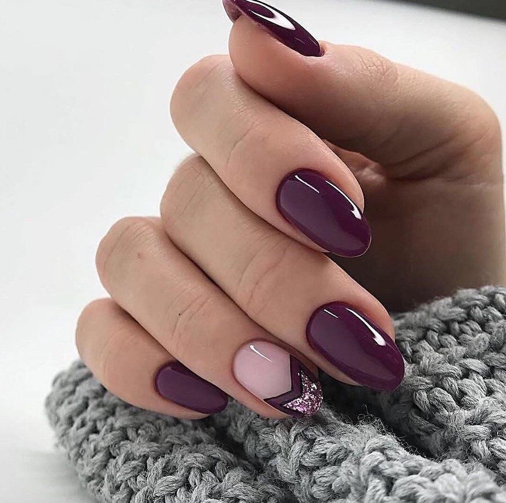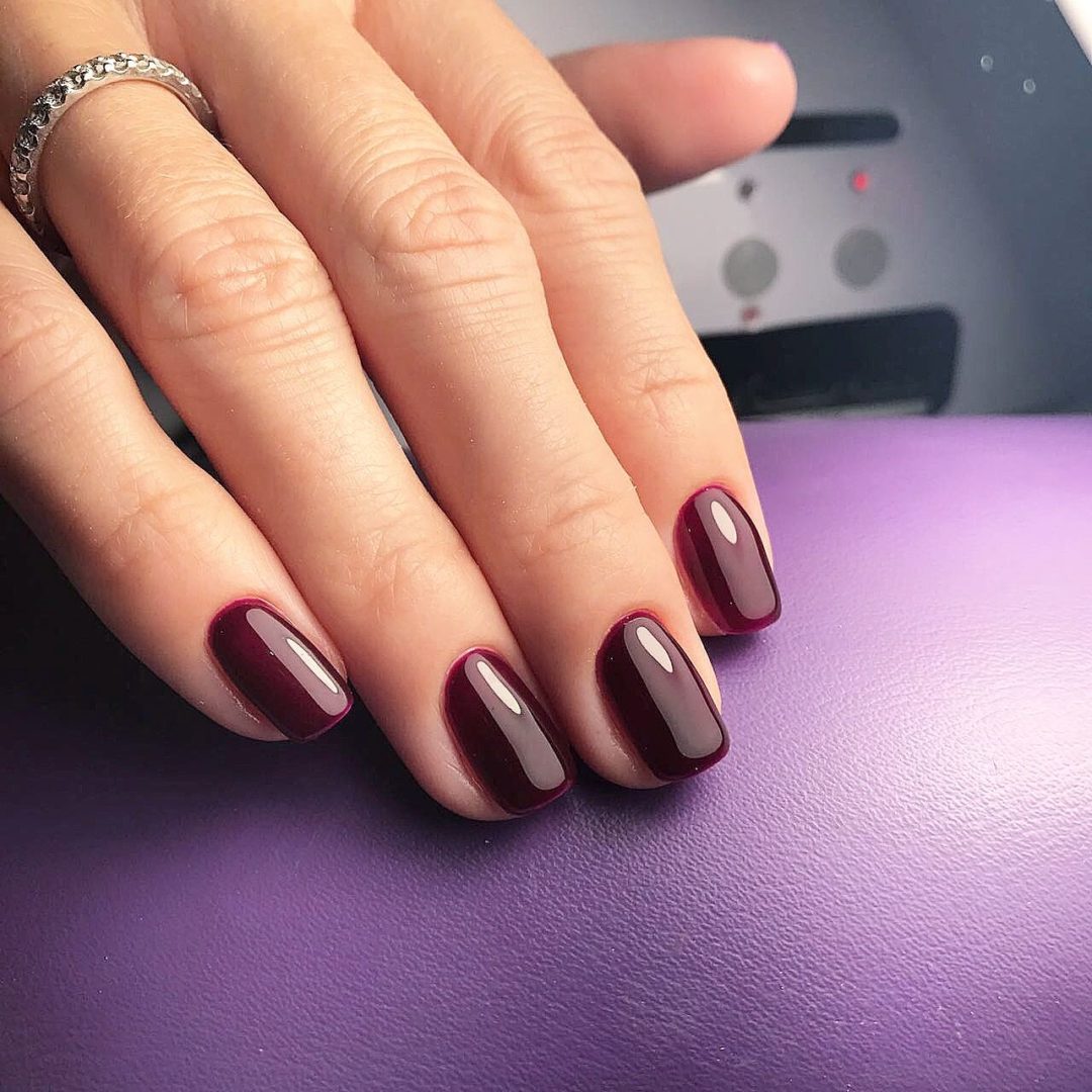 - винный. Классический вариант офисного маникюра — применение матового, винного цвета, зачастую им выделяют несколько ногтей, а остальные оставляют в сдержанных, нюдовых тонах.