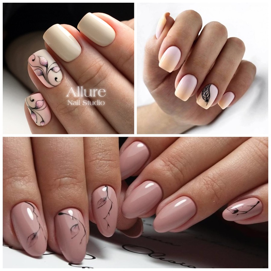 Еле заметные штрихи, точки или изображения узоров из растений на нейтральных оттенках лака ногтей создадут эффект элегантности в любом стиле женщины.