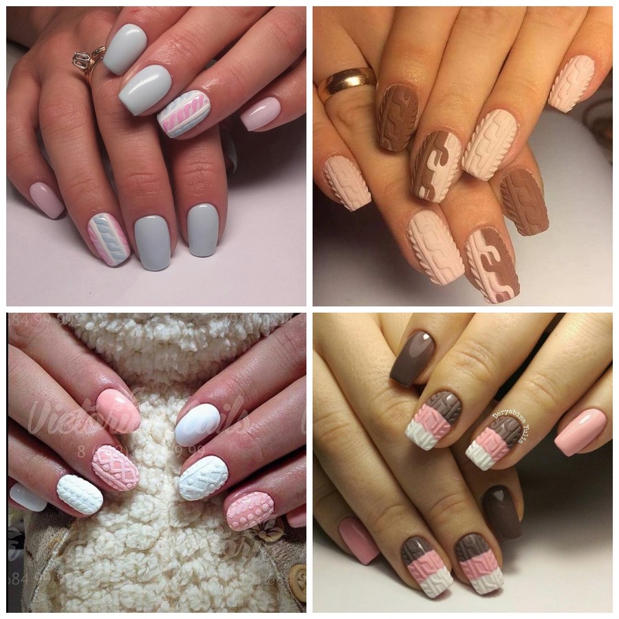 Декор ногтей, имитирующий вязанный узор, признан трендом 2018-2019 сезона. Он допустим и для создания делового образа, если лепка будет не сильно объемной. В качестве основы допускаются неброские светлые тона (голубой, молочный, бледный розовый).
