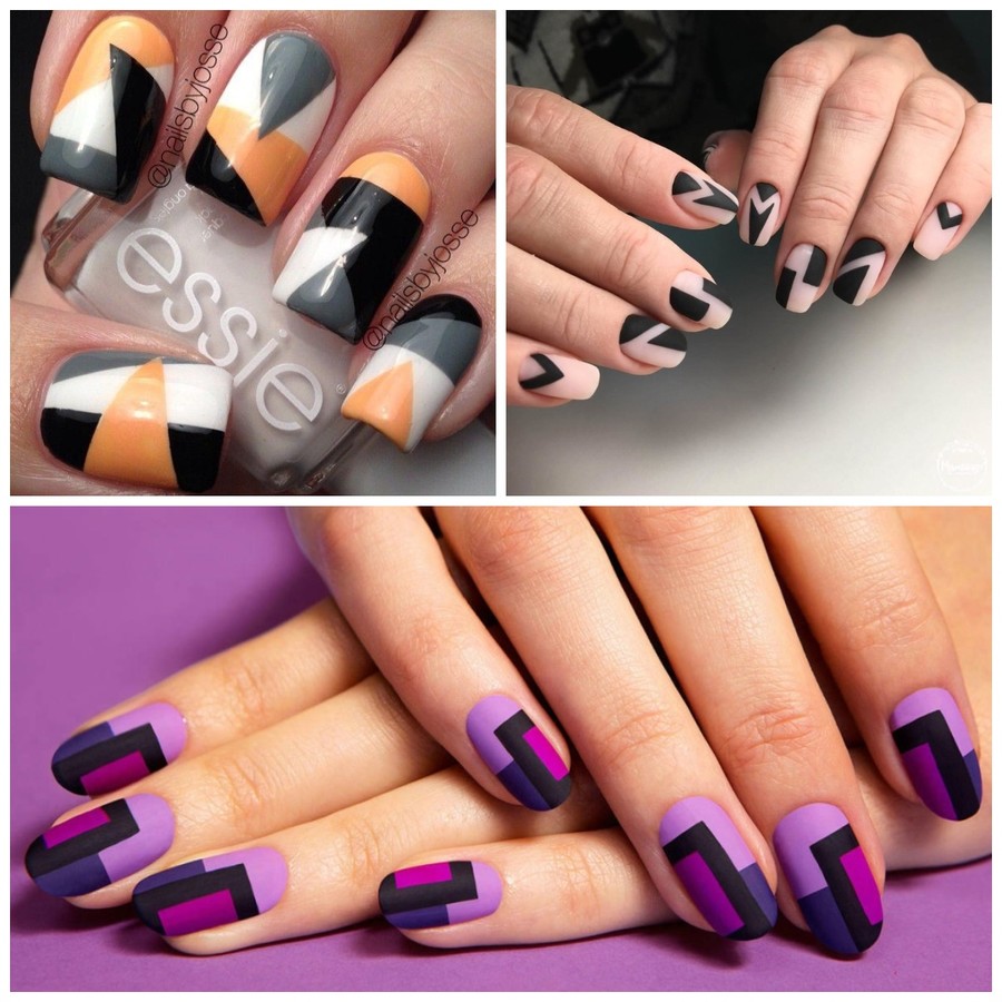 - геометрическая тематика. Оформление ногтей в геометрическом стиле позволит разнообразить однотипный бежевый или пастельный цвет. Кроме того, геометрия выбивается вперёд в трендах 2023-2024 годов и является лидирующей. Её применяют везде: в офисных и деловых, а также ярких и подростковых стилях. Оригинально смотрится геометрическое глянцевое покрытие на нюдовом основании ногтя. Это позволяет создать необычный образ, который придётся по душе каждой моднице. Плюсом такого оформления является то, что геометрию можно наносить на любую основу;
