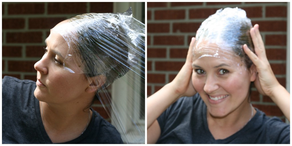 После того, как краской обработаны все локоны, их следует утеплить. Для этого сначала наденьте на волосы шапочку или пакет, а сверху замотайте их полотенцем.