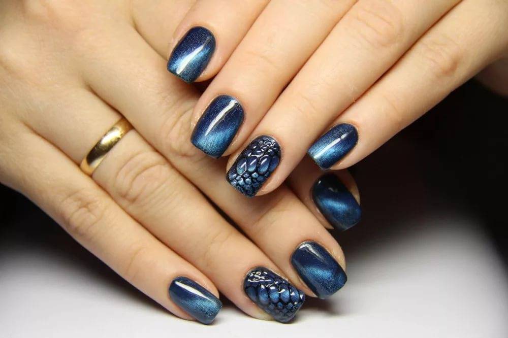 Сама по себе техника «кошачий глаз» предполагает яркий и привлекающий взгляды эффект, но для придания еще большей нарядности можно использовать стразы, наклейки для ногтей, лепнину или другие элементы декора.