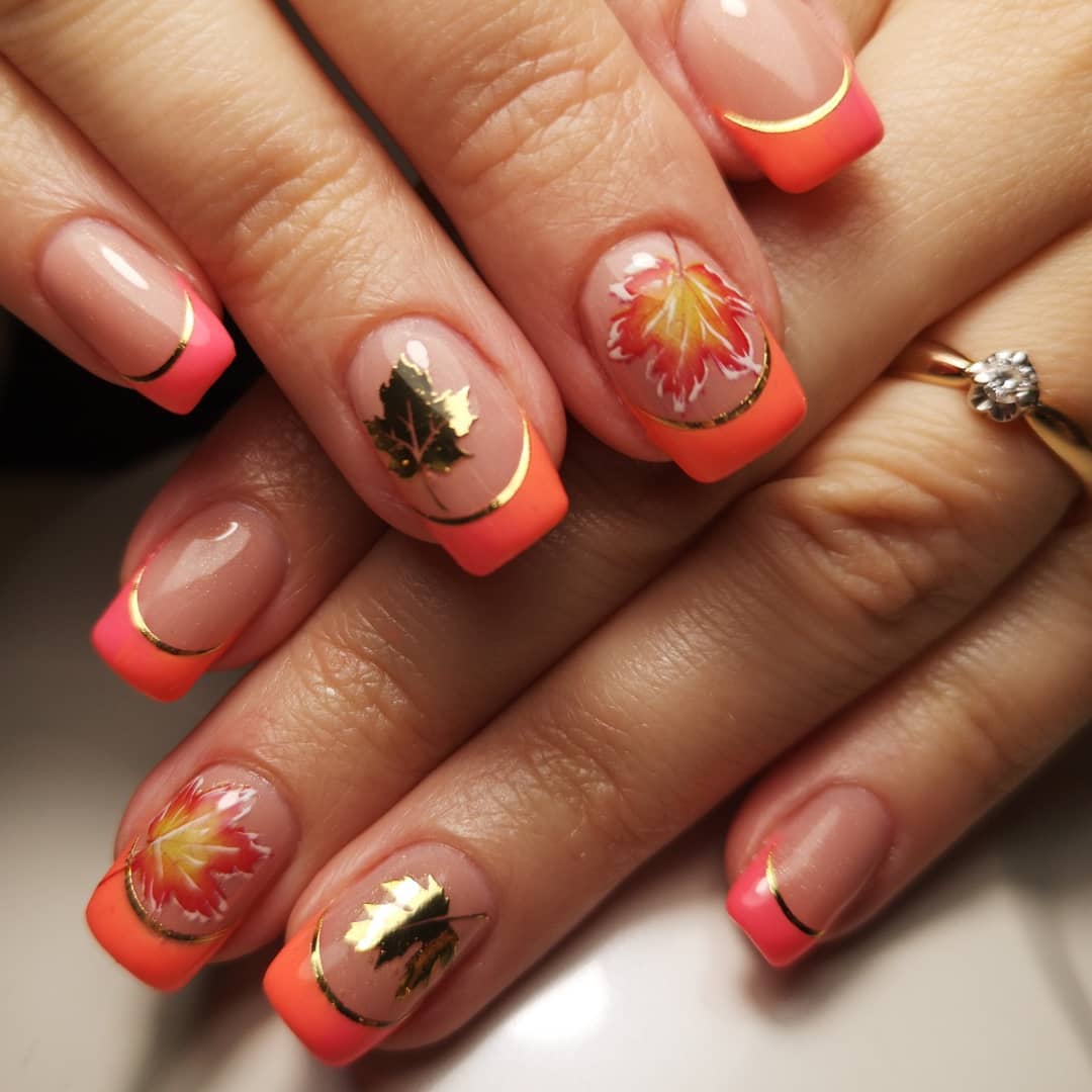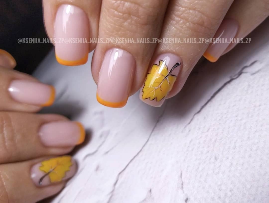 Французский маникюр с осенними листьями — это что-то новенькое и креативное, любительницам классики должен понравиться данный дизайн маникюра. Причем сам французский маникюр не обязательно делать базового белого цвета, проявите креативность и попробуйте заменить его на: оранжевый, желтый, зеленый или золотой оттенок. Мастера маникюрного искусства предлагают нам украшать один или несколько ногтей изображением ярких листьев. Лучше сделать акцент на безымянном ногте. С французским маникюром уместно смотрятся оранжево-желтые кленовые листочки, как больших, так и средних размеров. Кстати, на одном ногте можно расположить сразу несколько листьев в хаотичном порядке, чтобы создать эффект падающей осенней листвы в лесу.