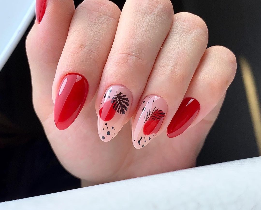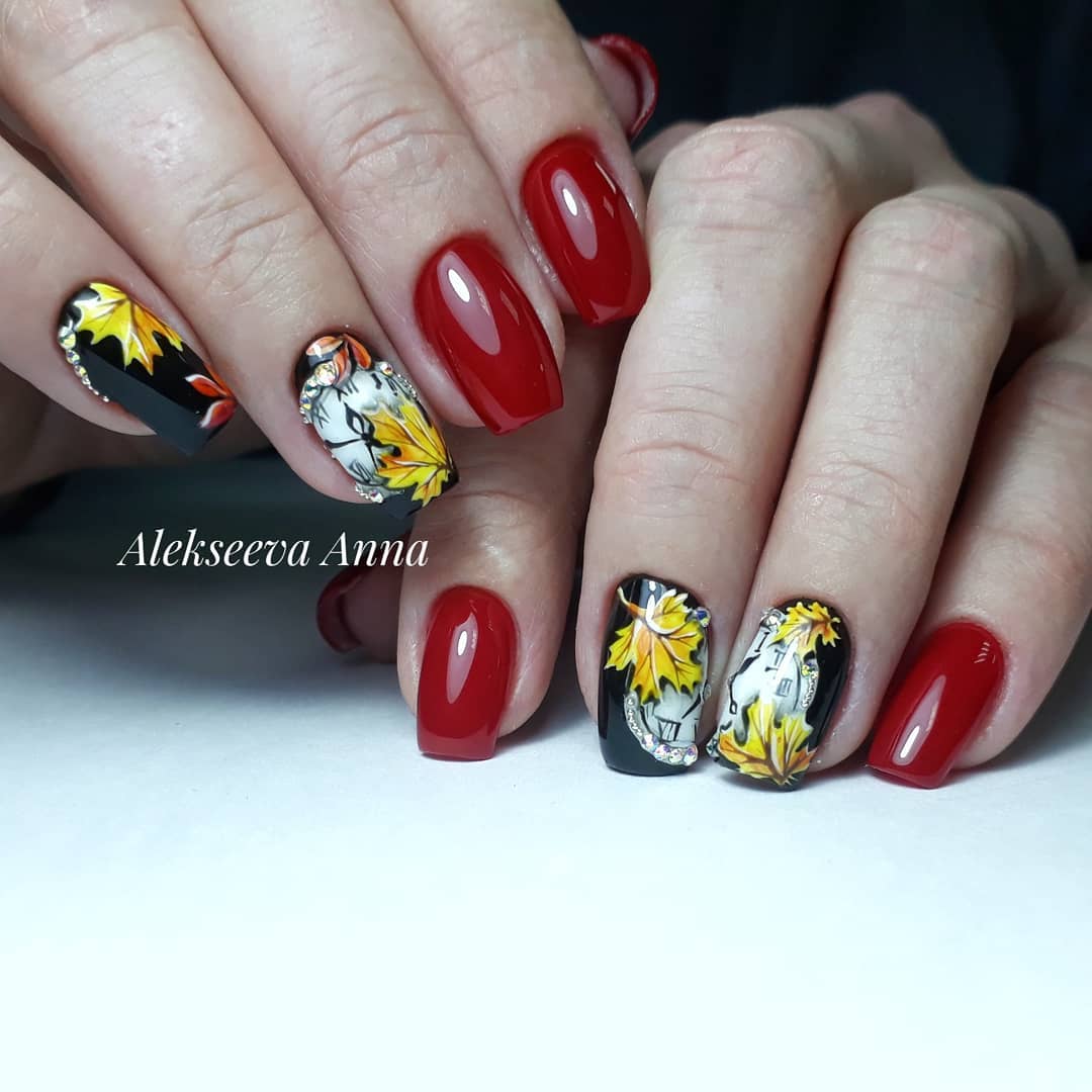 Осенние листья на ногтях можно совместить с красным цветом лака. Чтобы листья «не потерялись» на пестром полотне, для основного фона лучше взять нейтральный оттенок, а вот все остальные ногти, без рисунков, будет уместно для яркости накрасить красным лаком. Для осеннего маникюра лучше выбирать не светло-красный, а насыщенный красный с ноткой бордового оттенка лак. Идеальным завершением маникюра станет глянцевое покрытие. Преобразить и в тоже время дополнить и без того насыщенный маникюр можно с помощью паутинки, страз, втирки, шиммера, а также прелестной золотой или серебряной фольги.