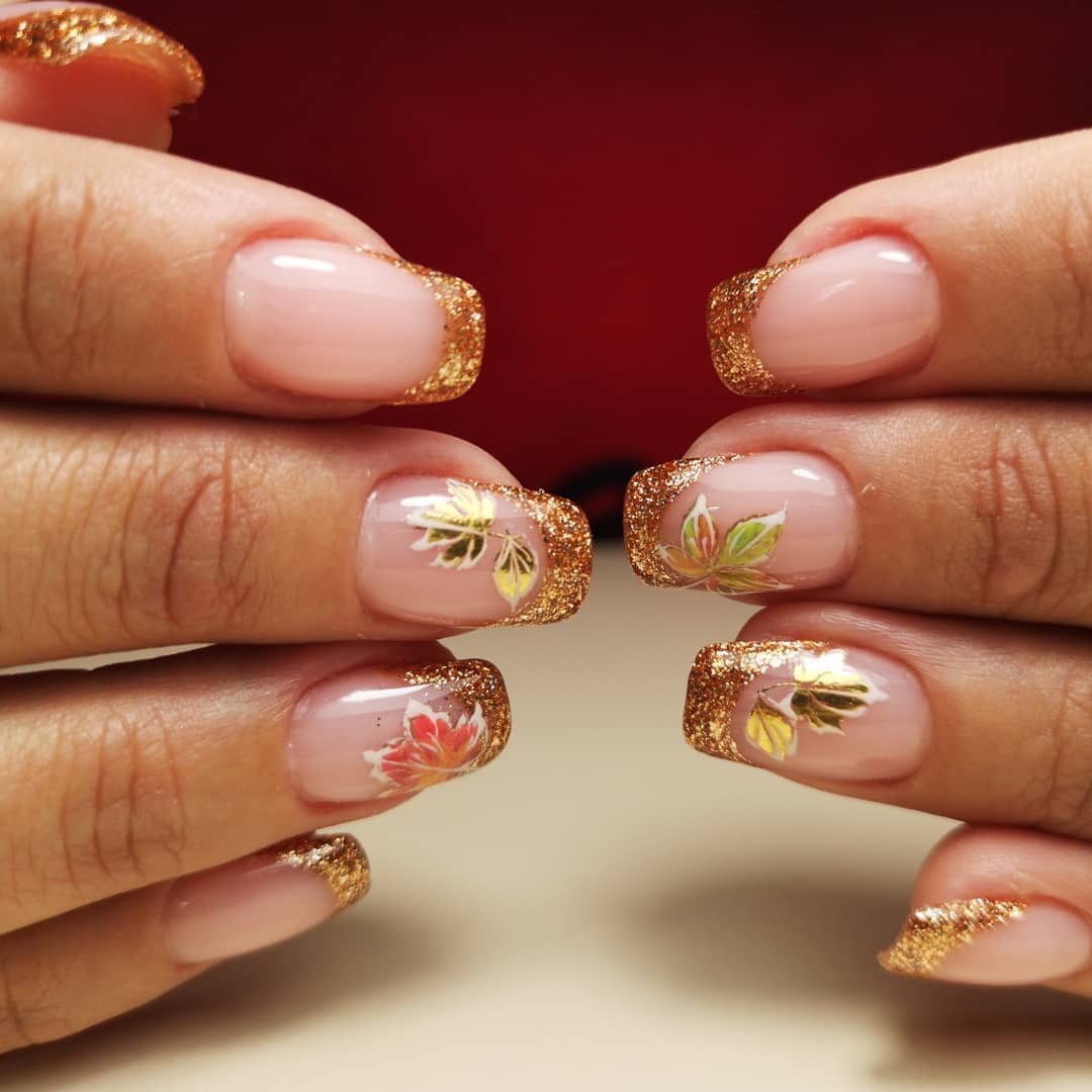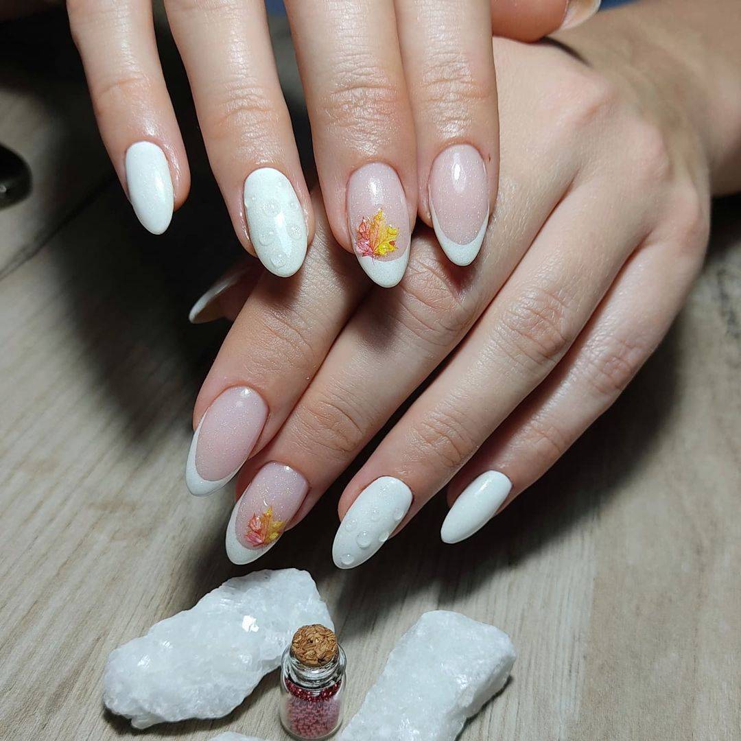 Отличным выбором для колоритного осеннего дизайна маникюра с листьями будет молочный фон. Нейтральный оттенок лака позволит проявить весь креатив сполна. Молочный оттенок лака передаст контрастность выбранных вами оттенков, добавит идеальную цветовую коррекцию и в целом сделает маникюр максимально выразительным. Чтобы маникюр приобрел праздничный внешний вид, дополните дизайн с осенними листами красочной фольгой или же добавьте несколько золотых бликов с помощью тонкой кости для рисования.