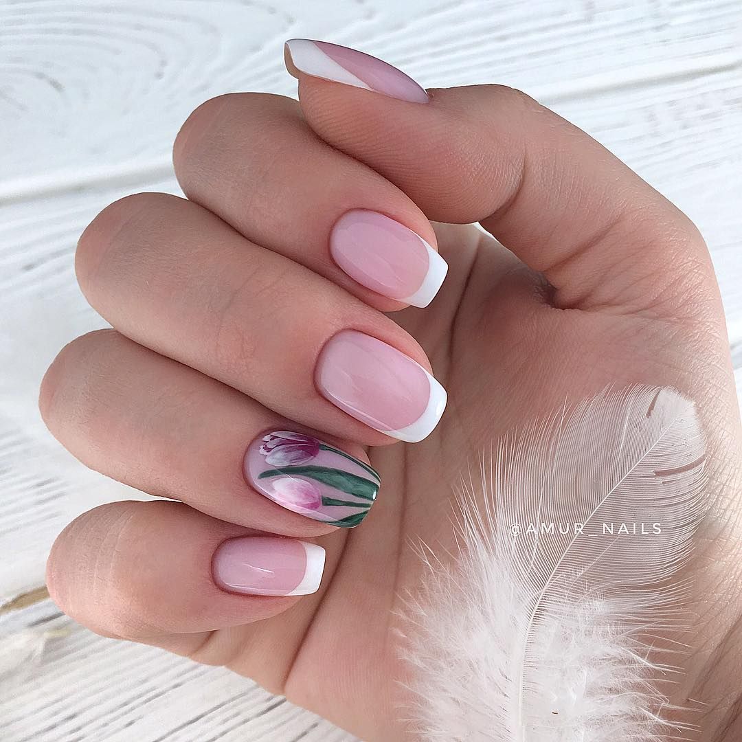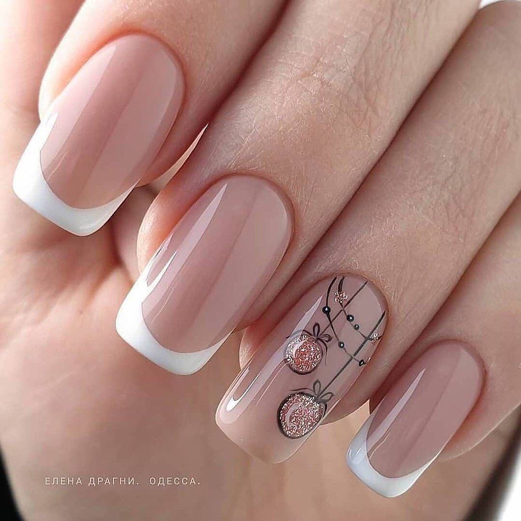В топе модных тенденций французский маникюр с рисунком. Здесь несколько ногтей дополнительно украшаются рисунком. Выбор принта зависит от вашей фантазии, но все еще популярны растительные, абстрактные и цветочные мотивы.