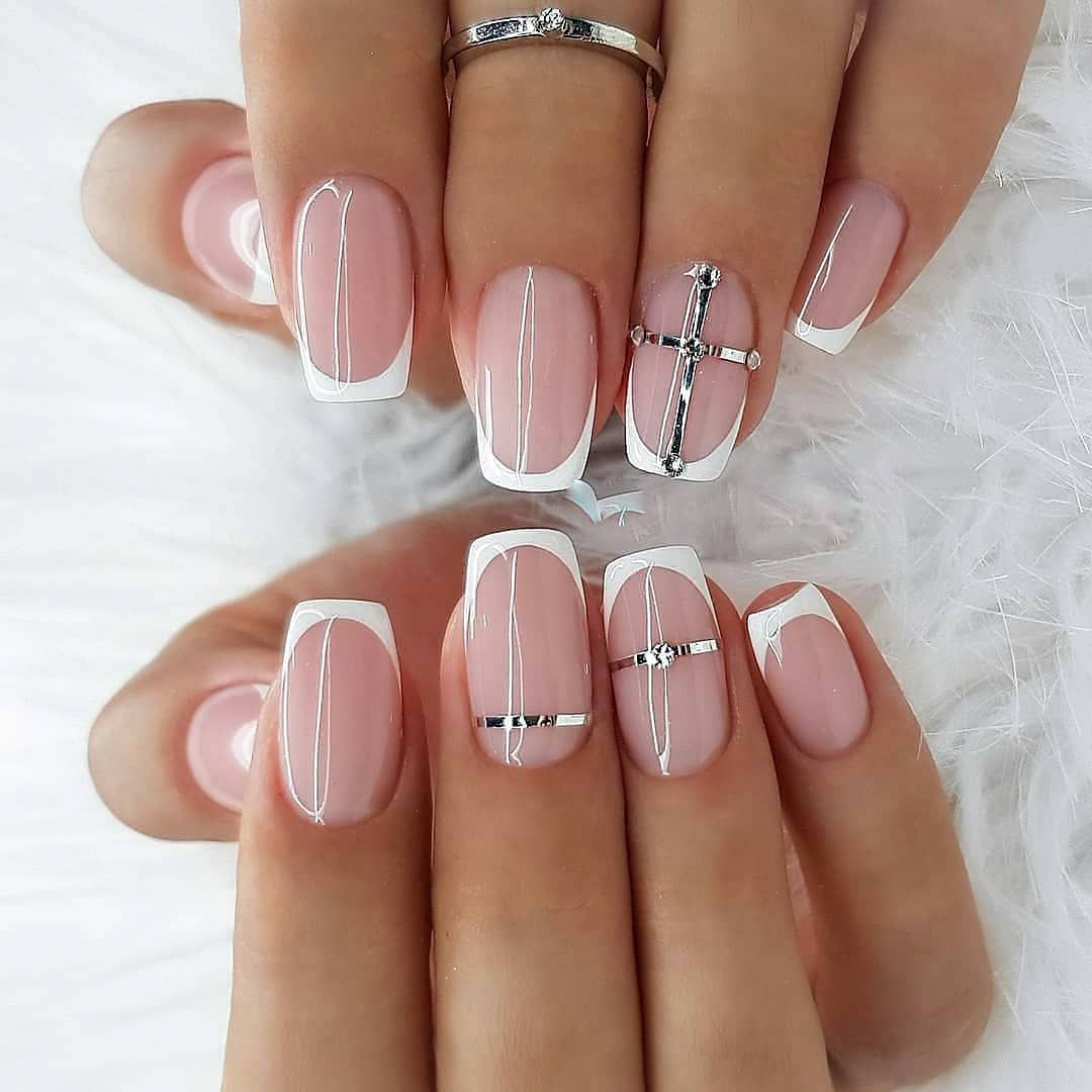 Французский маникюр на форму квадрат должен визуально скрадывать уголки пластины, делая ее более мягкой. Если длина средняя или короткая, французский маникюр дополняют дизайном, который визуально вытянет пластину. Например, абстрактным рисунком, располагая его по диагонали или вертикально. Или стразами — стильно и элегантно смотрится вертикальная полоска посередине ногтя.