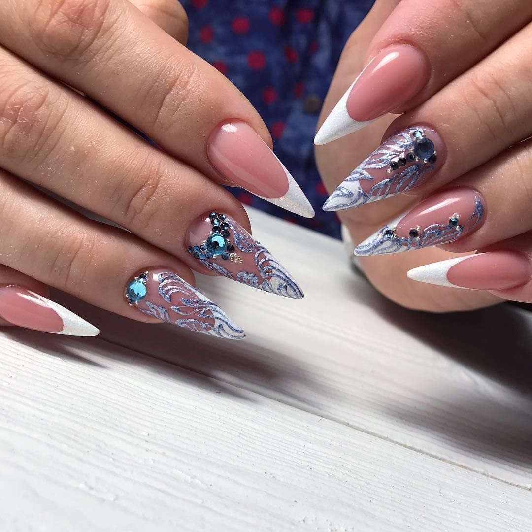 Форма ногтя может быть любой, для длинного френча подходят даже ногти-стилеты. Толщина улыбки тоже любая — от тонкой до широкой. Здесь можно активно экспериментировать и с формой каемки — шеврон, твист, косая или волнообразная. Длинные ногти позволяют украшать французский маникюр любым дизайном — блесками, фольгой, стразами, рисунками или наклейками.