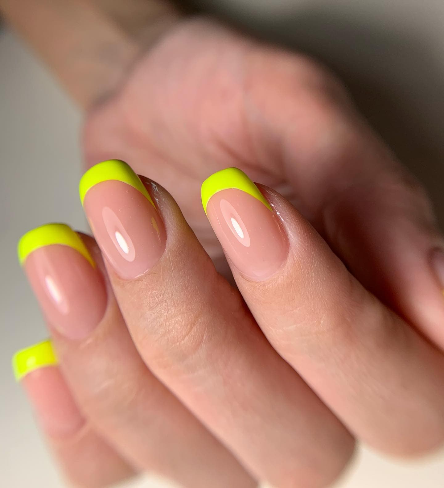 Еще один популярный вариант френча на ногтях, который все чаще мелькает в соц. сетях. Его сделать очень легко – достаточно окрасить край ногтя лаком любимого цвета. Лучше всего это делать с помощью трафаретов для французского маникюра. Самые модные оттенки: зеленый, желтый, оранжевый, ярко-розовый, голубой и сиреневый.