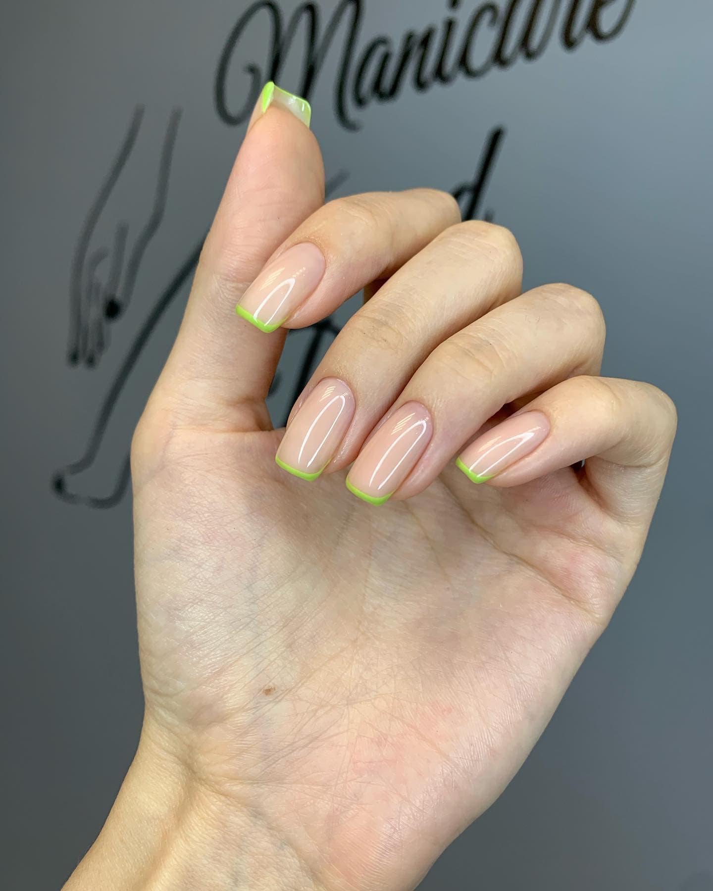 Оптимальная форма для короткой длины — квадрат или скругленный квадрат. Линия улыбки при этом должны быть тонкой или очень тонкой, чтобы визуально не укорачивать ногти и кисти рук. А вот цвет каемки может быть любым — от классического белого или черного до яркого неонового.