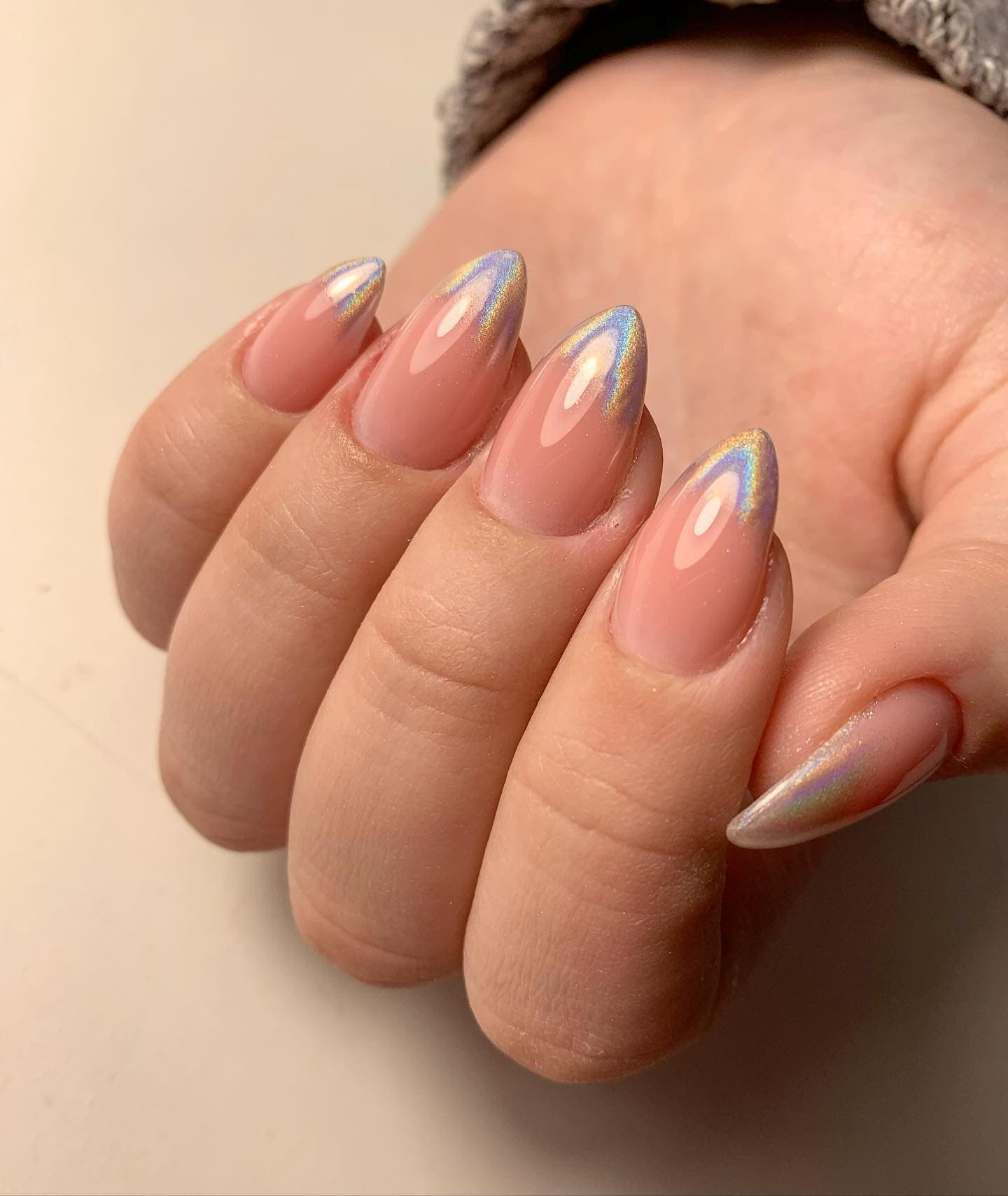 Для этого дизайна есть одно важное правило: не переборщить с количеством кусочков, чтобы ваш маникюр не выглядел наляписто. Выберите два акцентных ноготка и распределите на них осколочки фольги, которые гармонируют с основным цветом французского маникюра