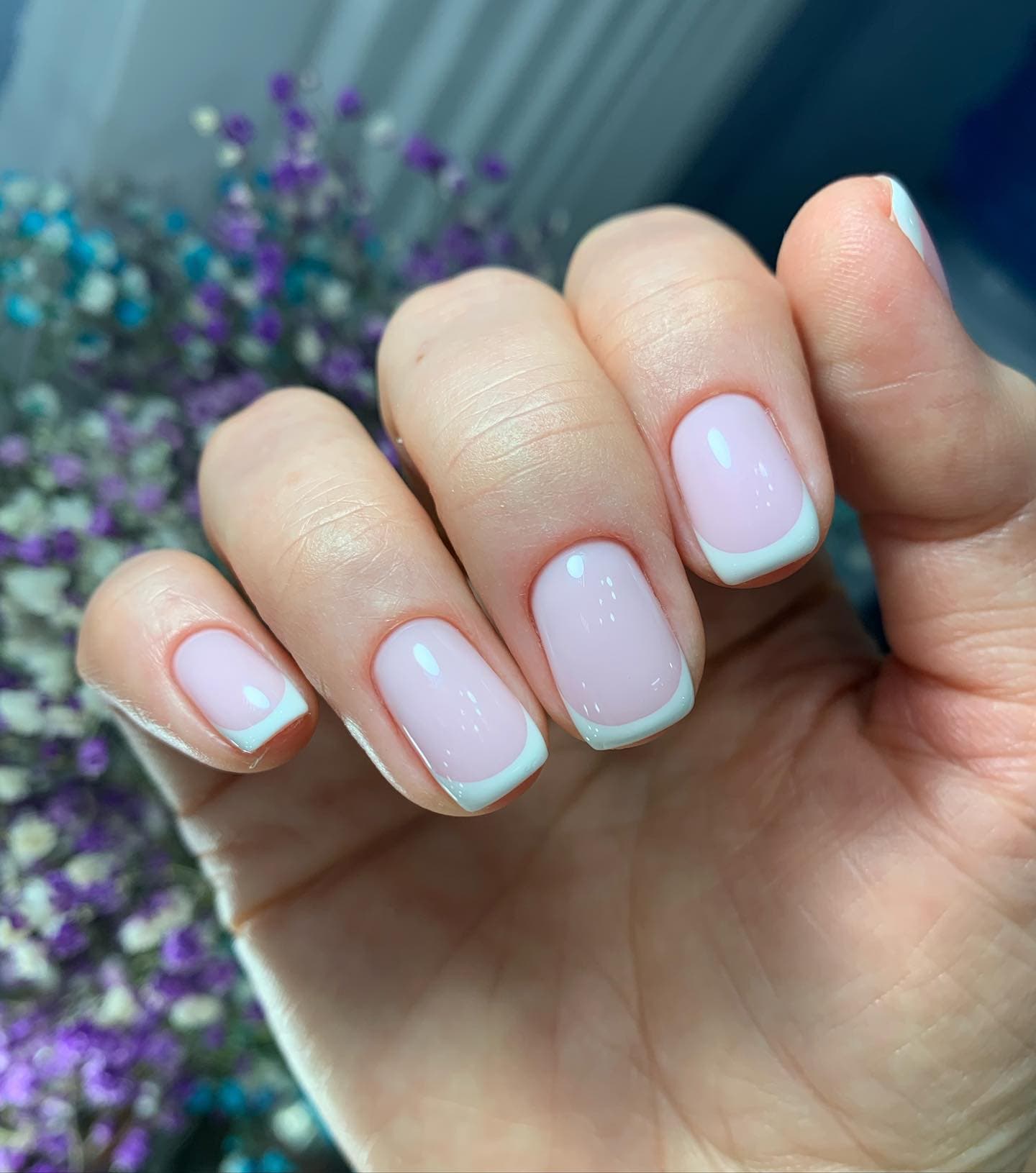 Предпочтительно это классический или лунный французский маникюр в голубых пастельных тонах, с аквариумным акцентом на нескольких пальцах.