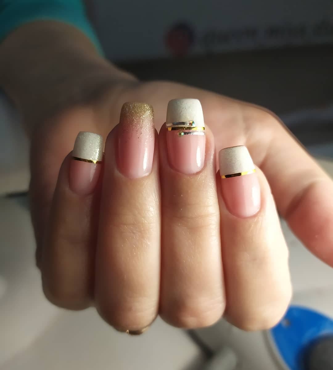 - декорированный. К белому френчу отлично подойдут не стразины и бусины, а пудровое покрытие, или мелкие блёстки;