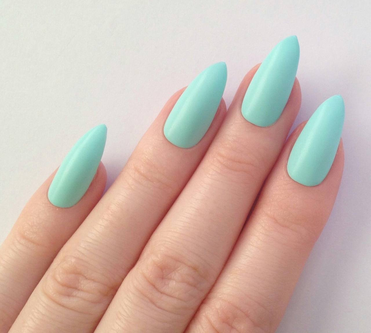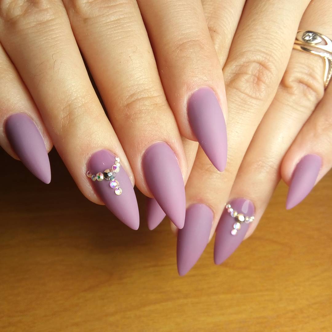 острая форма ногтей с матовым эффектом представлена на фото. Работа невероятной красоты. Дизайн можно дополнить с помощью полос или металлизированной поверхности;