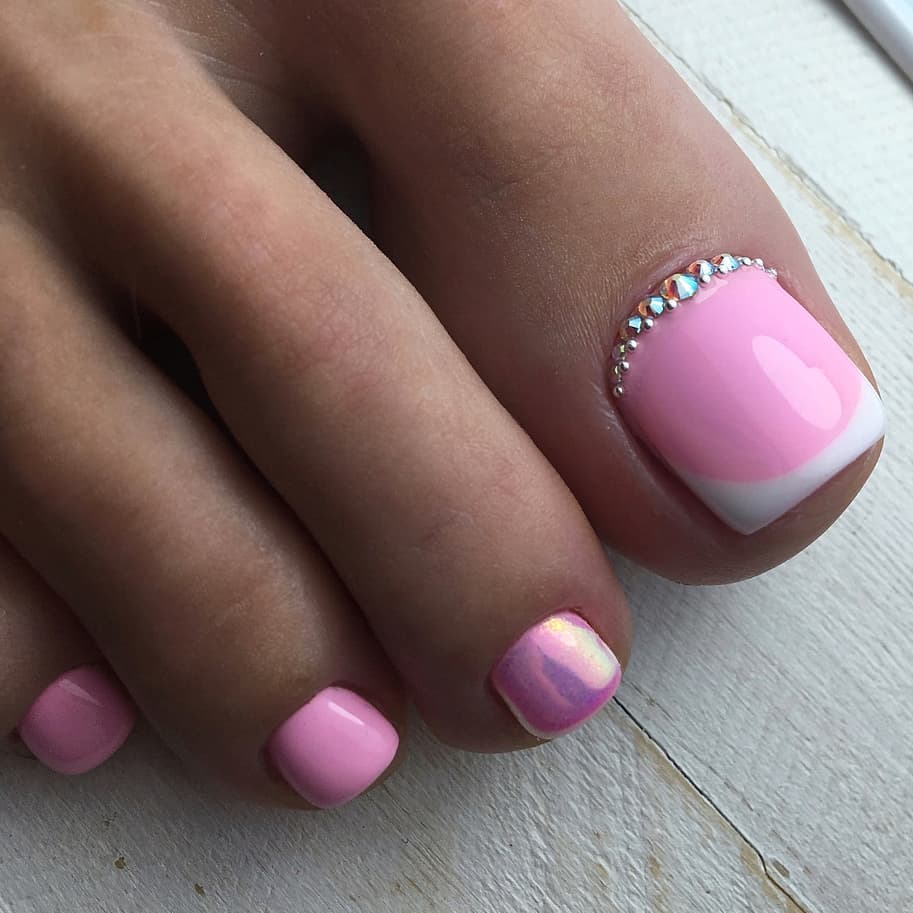 Использование светлых лаков, особенно пастельных, считается наиболее универсальным вариантом на ногах. Такой дизайн сочетается практически с любым стилем, одеждой, обувью и мероприятием. Он позволяет не обращать внимания на себя при оформлении маникюра, что дает дополнительную свободу в выборе. Кроме того, таким способом можно легко скрыть некоторые недостатки: слишком крупные пальцы и ногти, несовершенная форма – не будут бросаться в глаза. Украшением может стать все, что угодно: стразы, небольшой рисунок, френч и т.д.