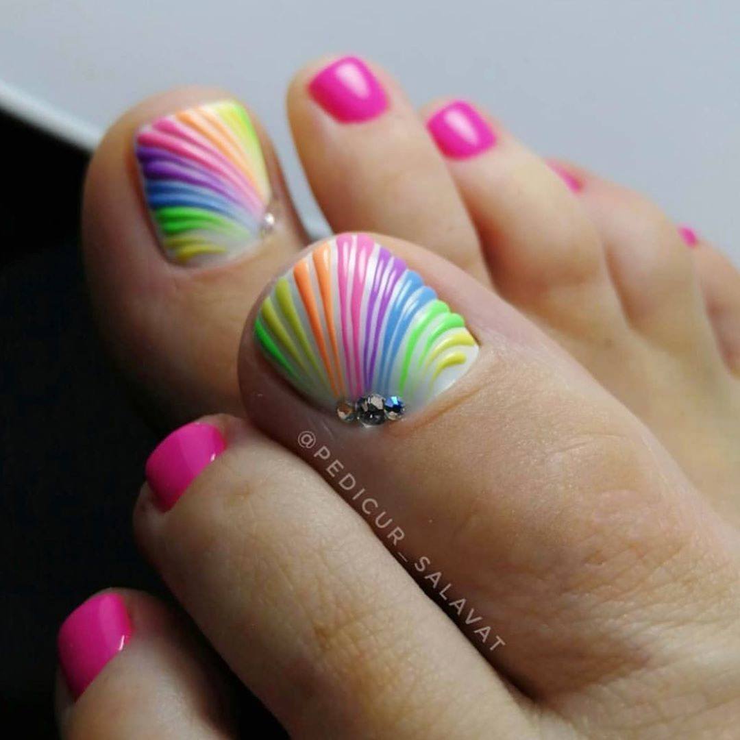 Как известно, молодое поколение испытывает некую слабость к всевозможным неоновым оттенкам и колерам в стиле «вырви глаз», поэтому дизайнеры предложили уверенно использовать подобные варианты покрытий для создания модного летнего педикюра. Это может быть однотонный дизайн, выполненный неоновым жёлтым, лимонным, зелёным, голубым или розовым цветом, педикюр с яркими рисунками, геометрическими композициями, элементами «негативного пространства» или растяжкой. Столь броские цвета можно дополнительно комбинировать с классическим белым либо чёрным цветом, дополнять объёмными украшениями и прочим декором