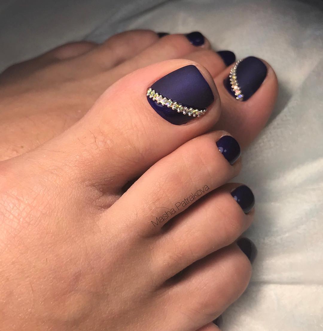 Вариант с синим педикюром выбирают относительно нечасто, но в 2019-2020 этот цвет считается самым модным. Синий цвет, ассоциируемый с небосводом и глубинами океана, притягивает взгляды своим очарованием и утончённостью. Педикюр в однотонном стиле станет элегантным дополнением к вечернему и повседневному образу.