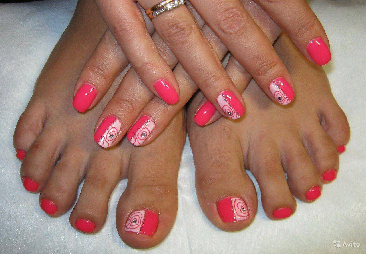 - Если задуман какой-то особенный маникюр, то хорошим вариантом будет идентичное оформление ногтей на ногах.